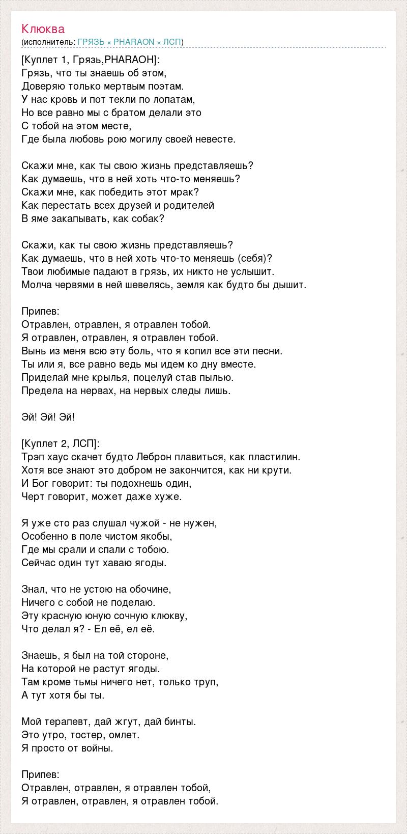 [Куплет 1, Грязь,PHARAOH]: Грязь, что ты знаешь об этом, Доверяю только мертвым поэтам. У нас кровь и пот текли по лопатам, Но все равно мы с братом делали это С тобой на этом месте, Где была любовь рою могилу своей невесте. Скажи мне, как ты свою жизнь представляешь? Как думаешь, что в ней хоть что-то меняешь? Скажи мне, как победить этот мрак? Как перестать всех друзей и родителей В яме закапывать, как собак? Скажи, как ты свою жизнь представляешь? Как думаешь, что в ней хоть что-то меняешь (себя)? Твои любимые падают в грязь, их никто не услышит. Молча червями в ней шевелясь, земля как будто бы дышит. Припев: Отравлен, отравлен, я отравлен тобой. Я отравлен, отравлен, я отравлен тобой. Вынь из меня всю эту боль, что я копил все эти песни. Ты или я, все равно ведь мы идем ко дну вместе. Приделай мне крылья, поцелуй став пылью. Предела на нервах, на нервых следы лишь. Эй! Эй! Эй! [Куплет 2, ЛСП]: Трэп хаус скачет будто Леброн плавиться, как пластилин. Хотя все знают это добром не закончится, как ни крути. И Бог говорит: ты подохнешь один, Черт говорит, может даже хуже. Я уже сто раз слушал чужой - не нужен, Особенно в поле чистом якобы, Где мы срали и спали с тобою. Сейчас один тут хаваю ягоды. Знал, что не устою на обочине, Ничего с собой не поделаю. Эту красную юную сочную клюкву, Что делал я? - Ел её, ел её. Знаешь, я был на той стороне, На которой не растут ягоды. Там кроме тьмы ничего нет, только труп, А тут хотя бы ты. Мой терапевт, дай жгут, дай бинты. Это утро, тостер, омлет. Я просто от войны. Припев: Отравлен, отравлен, я отравлен тобой, Я отравлен, отравлен, я отравлен тобой.