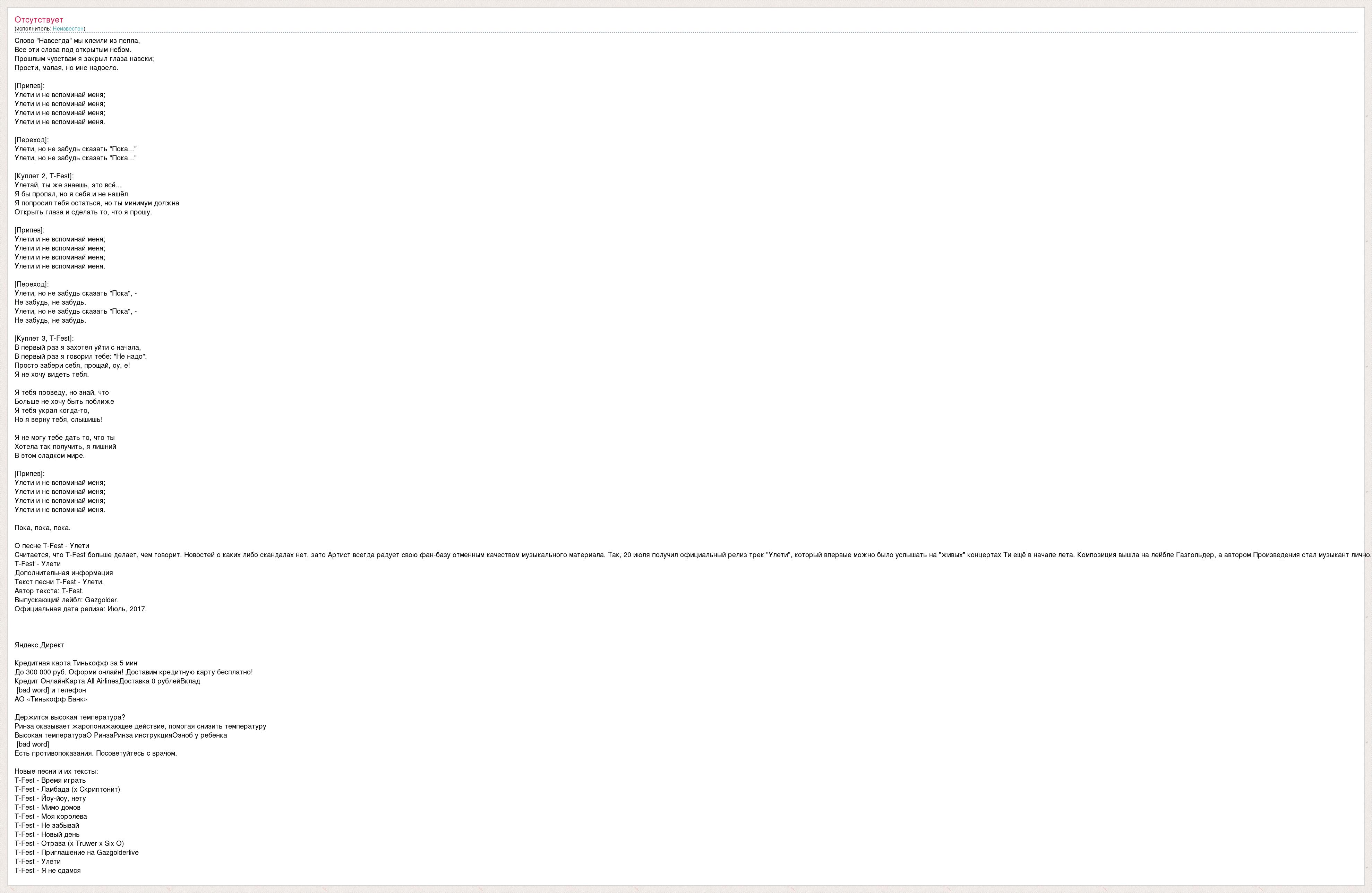 Слово "Навсегда" мы клеили из пепла, Все эти слова под открытым небом. Прошлым чувствам я закрыл глаза навеки; Прости, малая, но мне надоело. [Припев]: Улети и не вспоминай меня; Улети и не вспоминай меня; Улети и не вспоминай меня; Улети и не вспоминай меня. [Переход]: Улети, но не забудь сказать "Пока..." Улети, но не забудь сказать "Пока..." [Куплет 2, T-Fest]: Улетай, ты же знаешь, это всё... Я бы пропал, но я себя и не нашёл. Я попросил тебя остаться, но ты минимум должна Открыть глаза и сделать то, что я прошу. [Припев]: Улети и не вспоминай меня; Улети и не вспоминай меня; Улети и не вспоминай меня; Улети и не вспоминай меня. [Переход]: Улети, но не забудь сказать "Пока", - Не забудь, не забудь. Улети, но не забудь сказать "Пока", - Не забудь, не забудь. [Куплет 3, T-Fest]: В первый раз я захотел уйти с начала, В первый раз я говорил тебе: "Не надо". Просто забери себя, прощай, оу, е! Я не хочу видеть тебя. Я тебя проведу, но знай, что Больше не хочу быть поближе Я тебя украл когда-то, Но я верну тебя, слышишь! Я не могу тебе дать то, что ты Хотела так получить, я лишний В этом сладком мире. [Припев]: Улети и не вспоминай меня; Улети и не вспоминай меня; Улети и не вспоминай меня; Улети и не вспоминай меня. Пока, пока, пока. О песне T-Fest - Улети Считается, что T-Fest больше делает, чем говорит. Новостей о каких либо скандалах нет, зато Артист всегда радует свою фан-базу отменным качеством музыкального материала. Так, 20 июля получил официальный релиз трек "Улети", который впервые можно было услышать на "живых" концертах Ти ещё в начале лета. Композиция вышла на лейбле Газгольдер, а автором Произведения стал музыкант лично. T-Fest - Улети Дополнительная информация Текст песни T-Fest - Улети. Автор текста: T-Fest. Выпускающий лейбл: Gazgolder. Официальная дата релиза: Июль, 2017. Яндекс.Директ Кредитная карта Тинькофф за 5 мин До 300 000 руб. Оформи онлайн! Доставим кредитную карту бесплатно! Кредит ОнлайнКарта All AirlinesДоставка 0 рублейВклад [bad word] и телефон АО «Тинькофф Банк» Держится высокая температура? Ринза оказывает жаропонижающее действие, помогая снизить температуру Высокая температураО РинзаРинза инструкцияОзноб у ребенка [bad word] Есть противопоказания. Посоветуйтесь с врачом. Новые песни и их тексты: T-Fest - Время играть T-Fest - Ламбада (x Скриптонит) T-Fest - Йоу-йоу, нету T-Fest - Мимо домов T-Fest - Моя королева T-Fest - Не забывай T-Fest - Новый день T-Fest - Отрава (x Truwer x Six O) T-Fest - Приглашение на Gazgolderlive T-Fest - Улети T-Fest - Я не сдамся