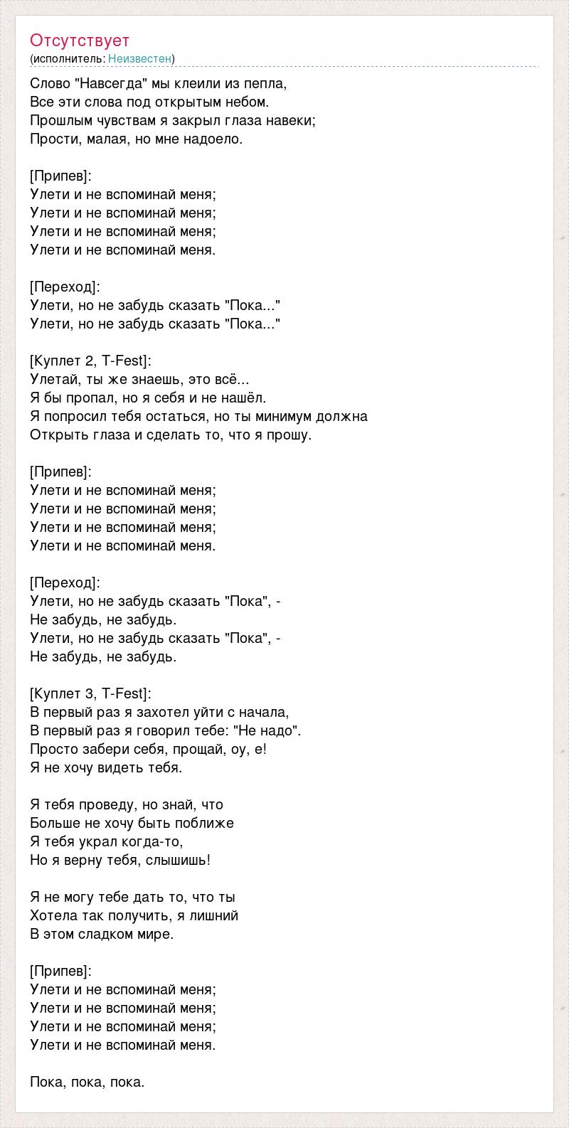 Слово "Навсегда" мы клеили из пепла, Все эти слова под открытым небом. Прошлым чувствам я закрыл глаза навеки; Прости, малая, но мне надоело. [Припев]: Улети и не вспоминай меня; Улети и не вспоминай меня; Улети и не вспоминай меня; Улети и не вспоминай меня. [Переход]: Улети, но не забудь сказать "Пока..." Улети, но не забудь сказать "Пока..." [Куплет 2, T-Fest]: Улетай, ты же знаешь, это всё... Я бы пропал, но я себя и не нашёл. Я попросил тебя остаться, но ты минимум должна Открыть глаза и сделать то, что я прошу. [Припев]: Улети и не вспоминай меня; Улети и не вспоминай меня; Улети и не вспоминай меня; Улети и не вспоминай меня. [Переход]: Улети, но не забудь сказать "Пока", - Не забудь, не забудь. Улети, но не забудь сказать "Пока", - Не забудь, не забудь. [Куплет 3, T-Fest]: В первый раз я захотел уйти с начала, В первый раз я говорил тебе: "Не надо". Просто забери себя, прощай, оу, е! Я не хочу видеть тебя. Я тебя проведу, но знай, что Больше не хочу быть поближе Я тебя украл когда-то, Но я верну тебя, слышишь! Я не могу тебе дать то, что ты Хотела так получить, я лишний В этом сладком мире. [Припев]: Улети и не вспоминай меня; Улети и не вспоминай меня; Улети и не вспоминай меня; Улети и не вспоминай меня. Пока, пока, пока.
