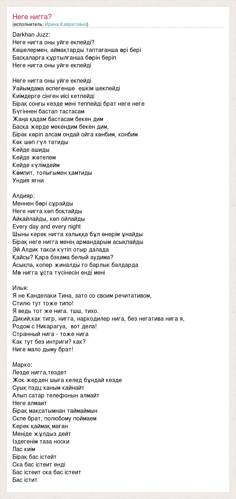 Darkhan Juzz: Неге нигга оны уйге екпейді? Көшелермен, аймақтарды таптағанша əрі бері Басқаларға құртылғанша бəрін беріп Неге нигга оны уйге екпейді Неге нигга оны уйге екпейді Уайымдама өспегенше ешкім шекпейді Киімдерге сінген иісі кетпейді Бірақ соңғы кезде мені теппейді брат неге неге Бүгіннен бастап тастасам Жаңа қадам бастасам бекен дим Басқа жерде мекендим бекен дим, Бiрак көріп алсам ондай ойга көнбим, конбим Көк шөп гүл татиды Кейде ашиды Кейде жөтелем Кейде күлімдейм Кəмпит, толығымен қамтиды Ундия яғни Алдияр: Меннен бəрі сұрайды Неге нигга көп боқтайды Айқайлайды, көп ойлайды Every day and every night Шыны керек нигга халыққа бұл өнерім ұнайды Бірақ неге нигга менің армандарым асықпайды Эй Алдик такси күтіп отыр далада Қайсы? Қара бэхама белый аудима? Асықпа, копер жиналды го барлык балдарда Мə нигга ұста түсінесін енді мені Илья: Я не Канделаки Тина, зато со своим речитативом, Стилю тут тоже типо! Я ведь тот же нига. тшш, тихо. Дикий,как тигр, нигга, наркодилер нига, без негатива нига я, Родом с Никарагуа, вот дела! Странный нига - тоже нига Как тут без интриги? как? Ниге мало дыму брат! Марко: Лезде нигга,тездет Жок жерден шыға келед бұндай кезде Суық пздц каным кайнайт Алып сатар телефонын алмайт Неге алмаит Бірақ мақсатымнан таймаймын Скпе брат, полюбому поймаем Керек қаймақ маған Меніде жұлдыз дейт Іздегенім таза носки Лас киім Бірақ бас істейт Ска бас істеит енді Бас істеит ска бас істеит Бас істит
