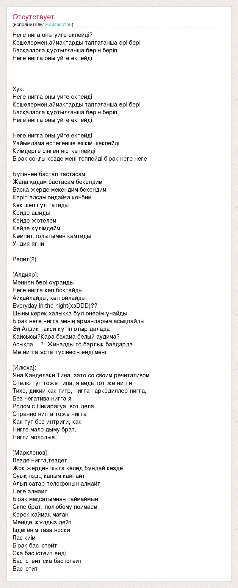 Неге нига оны уйге екпейді? Көшелермен,аймақтарды таптағанша əрі бері Басқаларға құртылғанша бəрін беріп Неге нигга оны уйге екпейді  Хук: Неге нигга оны уйге екпейді Көшелермен,аймақтарды таптағанша əрі бері Басқаларға құртылғанша бəрін беріп Неге нигга оны уйге екпейді Неге нигга оны уйге екпейді Уайымдама өспегенше ешкім шекпейді Киімдерге сінген иісі кетпейді Бірақ соңғы кезде мені теппейді бірақ неге неге Бүгіннен бастап тастасам Жаңа қадам бастасам бекендим Басқа жерде мекендим бекендим Көріп алсам ондайға көнбим Көк шөп гүл татиды Кейде ашиды Кейде жөтелем Кейде күлімдейм Кəмпит,толығымен қамтиды Ундия яғни Репит(2) [Алдияр]: Меннен бəрі сұраиды Неге нигга көп боқтайды Айқайлайды, көп ойлайды Everyday in the night(хзDDD)?? Шыны керек халыққа бұл өнерім ұнайды Бірақ неге нигга менің армандарым асықпайды Эй Алдик такси күтіп отыр далада Қайсысы?Қара бэхама белый аудима? Асықпа, ? Жиналды го барлык балдарда Мə нигга ұста түсінесін енді мені [Илюха]: Яна Канделаки Тина, зато со своим речитативом Стелю тут тоже типа, я ведь тот же нигги Тихо, дикий как тигр, нигга наркодиллер нигга, Без негатива нигга я Родом с Никарагуа, вот дела Странно нигга тоже нигга Как тут без интриги, как Нигге мало дыму брат, Нигги молодые. [Маркленов]: Лезде нигга,тездет Жок жерден шыға келед бұндай кезде Суық пздц каным кайнайт Алып сатар телефонын алмайт Неге алмаит Бірақ мақсатымнан таймаймын Скпе брат, полюбому поймаем Керек қаймақ маған Меніде жұлдыз дейт Іздегенім таза носки Лас киім Бірақ бас істейт Ска бас істеит енді Бас істеит ска бас істеит Бас істит