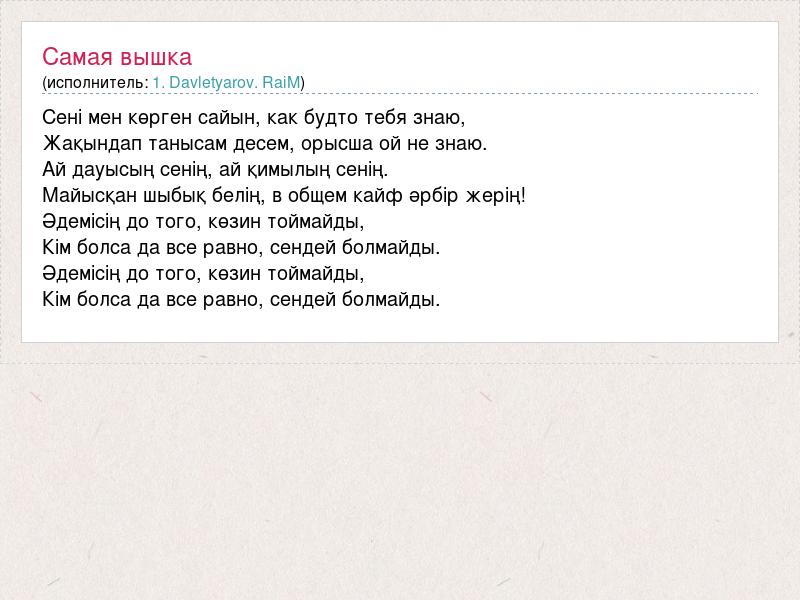 Сені мен көрген сайын, как будто тебя знаю, Жақындап танысам десем, орысша ой не знаю. Ай дауысың сенің, ай қимылың сенің. Майысқан шыбық белің, в общем кайф әрбір жерің! Әдемісің до того, көзин тоймайды, Кім болса да все равно, сендей болмайды. Әдемісің до того, көзин тоймайды, Кім болса да все равно, сендей болмайды.