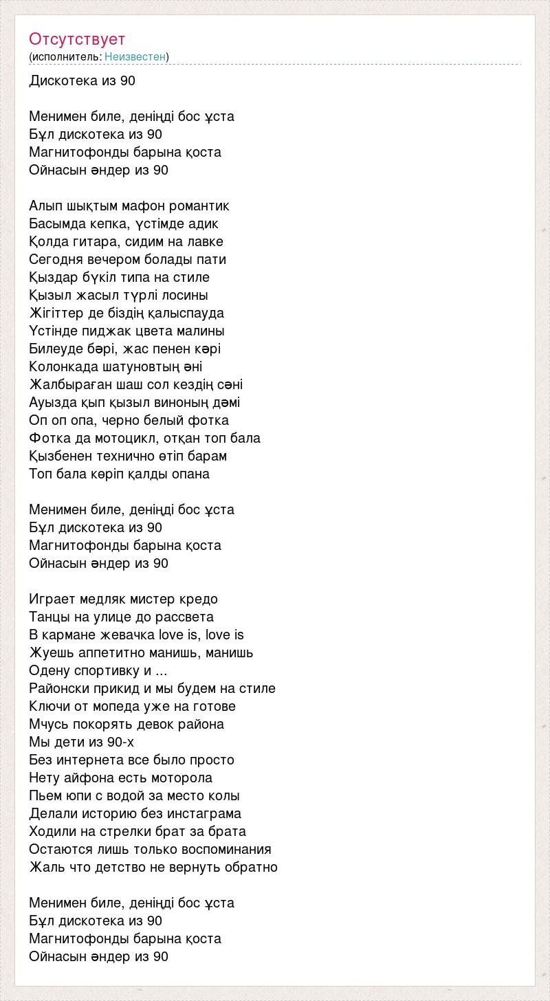 Дискотека из 90 Менимен биле, деніңді бос ұста Бұл дискотека из 90 Магнитофонды барына қоста Ойнасын əндер из 90 Алып шықтым мафон романтик Басымда кепка, үстімде адик Қолда гитара, сидим на лавке Сегодня вечером болады пати Қыздар бүкіл типа на стиле Қызыл жасыл түрлі лосины Жігіттер де біздің қалыспауда Үстінде пиджак цвета малины Билеуде бəрі, жас пенен кəрі Колонкада шатуновтың əні Жалбыраған шаш сол кездің сəні Ауызда қып қызыл виноның дəмі Оп оп опа, черно белый фотка Фотка да мотоцикл, отқан топ бала Қызбенен технично өтіп барам Топ бала көріп қалды опана Менимен биле, деніңді бос ұста Бұл дискотека из 90 Магнитофонды барына қоста Ойнасын əндер из 90 Играет медляк мистер кредо Танцы на улице до рассвета В кармане жевачка love is, love is Жуешь аппетитно манишь, манишь Одену спортивку и ... Районски прикид и мы будем на стиле Ключи от мопеда уже на готове Мчусь покорять девок района Мы дети из 90-х Без интернета все было просто Нету айфона есть моторола Пьем юпи с водой за место колы Делали историю без инстаграма Ходили на стрелки брат за брата Остаются лишь только воспоминания Жаль что детство не вернуть обратно Менимен биле, деніңді бос ұста Бұл дискотека из 90 Магнитофонды барына қоста Ойнасын əндер из 90