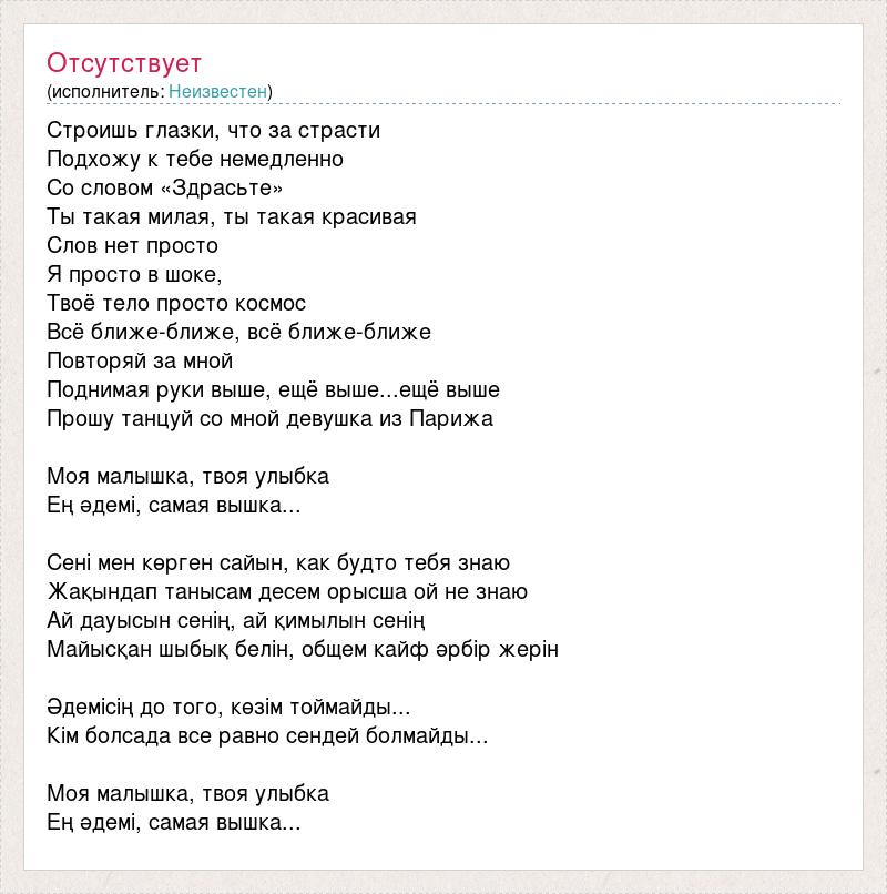 Строишь глазки, что за страсти Подхожу к тебе немедленно Со словом «Здрасьте» Ты такая милая, ты такая красивая Слов нет просто Я просто в шоке, Твоё тело просто космос Всё ближе-ближе, всё ближе-ближе Повторяй за мной Поднимая руки выше, ещё выше...ещё выше Прошу танцуй со мной девушка из Парижа Моя малышка, твоя улыбка Ең әдемі, самая вышка... Сені мен көрген сайын, как будто тебя знаю Жақындап танысам десем орысша ой не знаю Ай дауысын сенің, ай қимылын сенің Майысқан шыбық белін, общем кайф әрбір жерін Әдемісің до того, көзім тоймайды... Кім болсада все равно сендей болмайды... Моя малышка, твоя улыбка Ең әдемі, самая вышка...