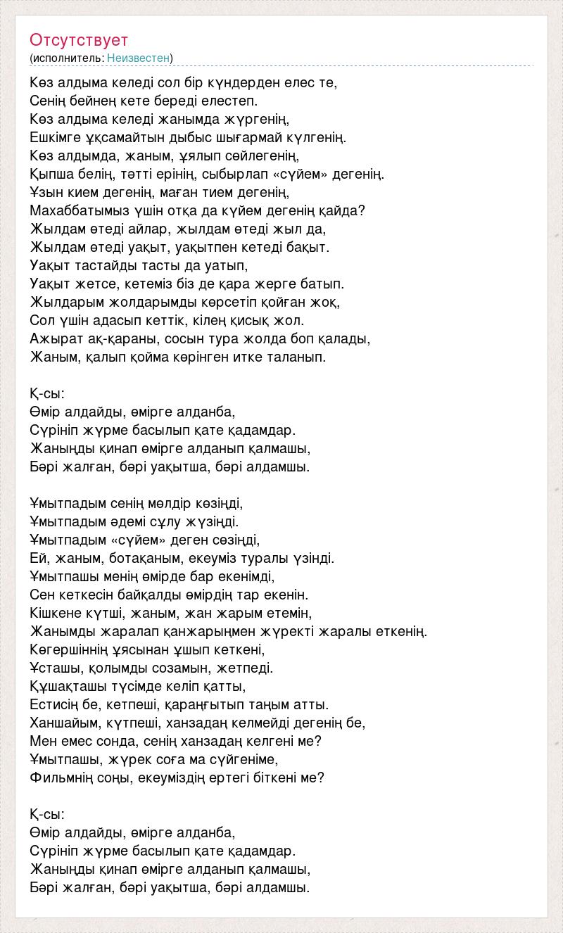 Көз алдыма келеді сол бір күндерден елес те, Сенің бейнең кете береді елестеп. Көз алдыма келеді жанымда жүргенің, Ешкімге ұқсамайтын дыбыс шығармай күлгенің. Көз алдымда, жаным, ұялып сөйлегенің, Қыпша белің, тәтті ерінің, сыбырлап «сүйем» дегенің. Ұзын кием дегенің, маған тием дегенің, Махаббатымыз үшін отқа да күйем дегенің қайда? Жылдам өтеді айлар, жылдам өтеді жыл да, Жылдам өтеді уақыт, уақытпен кетеді бақыт. Уақыт тастайды тасты да уатып, Уақыт жетсе, кетеміз біз де қара жерге батып. Жылдарым жолдарымды көрсетіп қойған жоқ, Сол үшін адасып кеттік, кілең қисық жол. Ажырат ақ-қараны, сосын тура жолда боп қалады, Жаным, қалып қойма көрінген итке таланып. Қ-сы: Өмір алдайды, өмірге алданба, Сүрініп жүрме басылып қате қадамдар. Жаныңды қинап өмірге алданып қалмашы, Бәрі жалған, бәрі уақытша, бәрі алдамшы. Ұмытпадым сенің мөлдір көзіңді, Ұмытпадым әдемі сұлу жүзіңді. Ұмытпадым «сүйем» деген сөзіңді, Ей, жаным, ботақаным, екеуміз туралы үзінді. Ұмытпашы менің өмірде бар екенімді, Сен кеткесін байқалды өмірдің тар екенін. Кішкене күтші, жаным, жан жарым етемін, Жанымды жаралап қанжарыңмен жүректі жаралы еткенің. Көгершіннің ұясынан ұшып кеткені, Ұсташы, қолымды созамын, жетпеді. Құшақташы түсімде келіп қатты, Естисің бе, кетпеші, қараңғытып таңым атты. Ханшайым, күтпеші, ханзадаң келмейді дегенің бе, Мен емес сонда, сенің ханзадаң келгені ме? Ұмытпашы, жүрек соға ма сүйгеніме, Фильмнің соңы, екеуміздің ертегі біткені ме? Қ-сы: Өмір алдайды, өмірге алданба, Сүрініп жүрме басылып қате қадамдар. Жаныңды қинап өмірге алданып қалмашы, Бәрі жалған, бәрі уақытша, бәрі алдамшы.