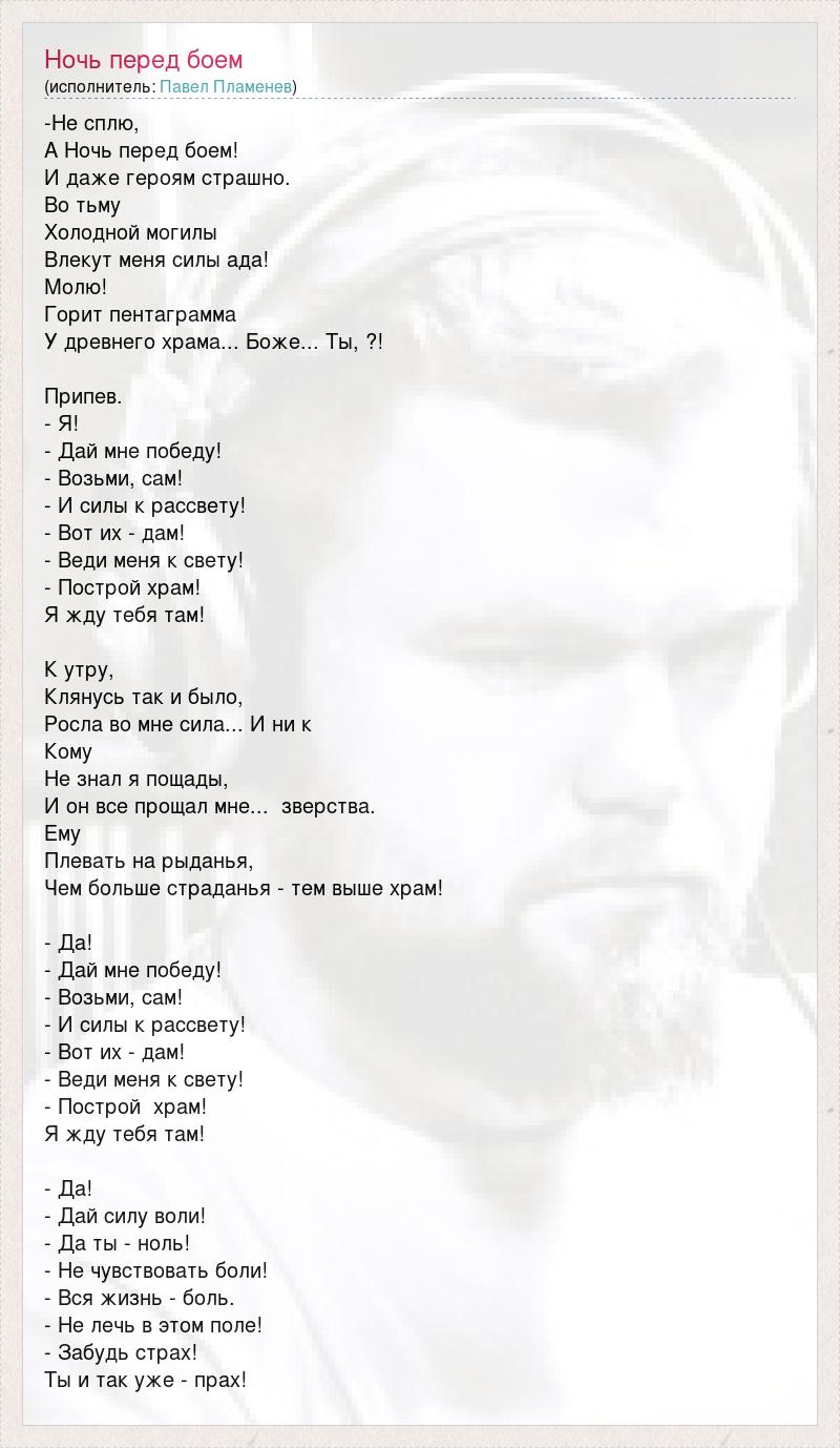 -Не сплю, А Ночь перед боем! И даже героям страшно. Во тьму Холодной могилы Влекут меня силы ада! Молю! Горит пентаграмма У древнего храма... Боже... Ты, ?! Припев. - Я! - Дай мне победу! - Возьми, сам! - И силы к рассвету! - Вот их - дам! - Веди меня к свету! - Построй храм! Я жду тебя там! К утру, Клянусь так и было, Росла во мне сила... И ни к Кому Не знал я пощады, И он все прощал мне... зверства. Ему Плевать на рыданья, Чем больше страданья - тем выше храм! - Да! - Дай мне победу! - Возьми, сам! - И силы к рассвету! - Вот их - дам! - Веди меня к свету! - Построй храм! Я жду тебя там! - Да! - Дай силу воли! - Да ты - ноль! - Не чувствовать боли! - Вся жизнь - боль. - Не лечь в этом поле! - Забудь страх! Ты и так уже - прах!