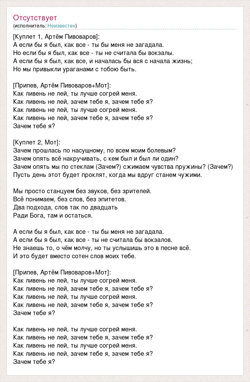 [Куплет 1, Артём Пивоваров]: А если бы я был, как все - ты бы меня не загадала. Но если бы я был, как все - ты не считала бы вокзалы. А если бы я был, как все, и началась бы вся с начала жизнь; Но мы привыкли ураганами с тобою быть. [Припев, Артём Пивоваров+Мот]: Как ливень не лей, ты лучше согрей меня. Как ливень не лей, зачем тебе я, зачем тебе я? Как ливень не лей, ты лучше согрей меня. Как ливень не лей, зачем тебе я, зачем тебе я? Зачем тебе я? [Куплет 2, Мот]: Зачем прошлась по насущному, по всем моим болевым? Зачем опять всё накручивать, с кем был и был ли один? Зачем опять мы по стеклам (Зачем?) сжимаем чувства пружины? (Зачем?) Пусть день этот будет проклят, когда мы вдруг станем чужими. Мы просто станцуем без звуков, без зрителей. Всё понимаем, без слов, без эпитетов. Два подхода, слов так по двадцать Ради Бога, там и остаться. А если бы я был, как все - ты бы меня не загадала. А если бы я был, как все - ты не считала бы вокзалов. Не знаешь то, о чём молчу, но ты услышишь это в песне всё. И это будет вместо сотен слов моих тебе. [Припев, Артём Пивоваров+Мот]: Как ливень не лей, ты лучше согрей меня. Как ливень не лей, зачем тебе я, зачем тебе я? Как ливень не лей, ты лучше согрей меня. Как ливень не лей, зачем тебе я, зачем тебе я? Зачем тебе я? Как ливень не лей, ты лучше согрей меня. Как ливень не лей, зачем тебе я, зачем тебе я? Как ливень не лей, ты лучше согрей меня. Как ливень не лей, зачем тебе я, зачем тебе я? Зачем тебе я?