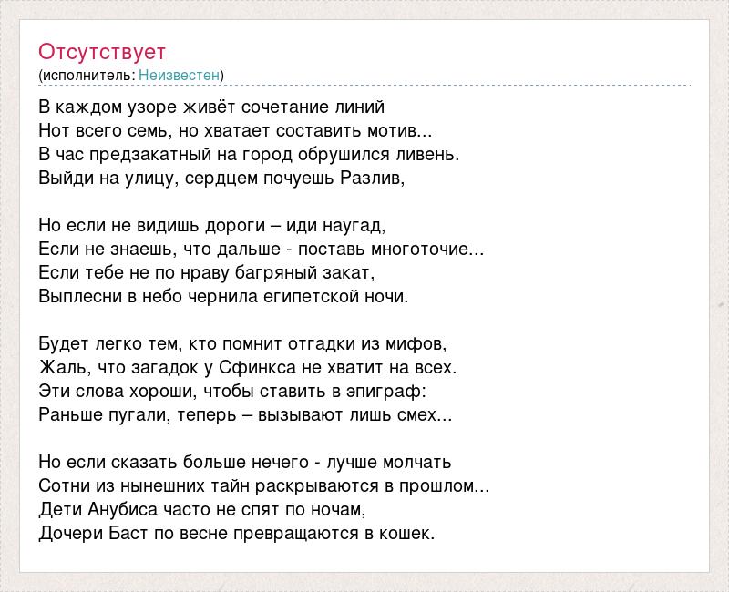 В каждом узоре живёт сочетание линий Нот всего семь, но хватает составить мотив... В час предзакатный на город обрушился ливень. Выйди на улицу, сердцем почуешь Разлив, Но если не видишь дороги – иди наугад, Если не знаешь, что дальше - поставь многоточие... Если тебе не по нраву багряный закат, Выплесни в небо чернила египетской ночи. Будет легко тем, кто помнит отгадки из мифов, Жаль, что загадок у Сфинкса не хватит на всех. Эти слова хороши, чтобы ставить в эпиграф: Раньше пугали, теперь – вызывают лишь смех... Но если сказать больше нечего - лучше молчать Сотни из нынешних тайн раскрываются в прошлом... Дети Анубиса часто не спят по ночам, Дочери Баст по весне превращаются в кошек.