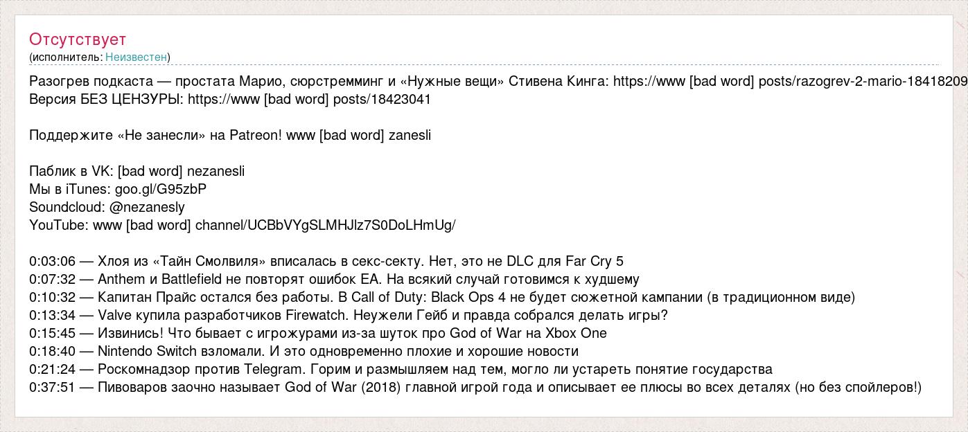 Разогрев подкаста — простата Марио, сюрстремминг и «Нужные вещи» Стивена Кинга: https://www [bad word] posts/razogrev-2-mario-18418209 Версия БЕЗ ЦЕНЗУРЫ: https://www [bad word] posts/18423041 Поддержите «Не занесли» на Patreon! www [bad word] zanesli Паблик в VK: [bad word] nezanesli Мы в iTunes: goo.gl/G95zbP Soundcloud: @nezanesly YouTube: www [bad word] channel/UCBbVYgSLMHJlz7S0DoLHmUg/ 0:03:06 — Хлоя из «Тайн Смолвиля» вписалась в секс-секту. Нет, это не DLC для Far Cry 5 0:07:32 — Anthem и Battlefield не повторят ошибок EA. На всякий случай готовимся к худшему 0:10:32 — Капитан Прайс остался без работы. В Call of Duty: Black Ops 4 не будет сюжетной кампании (в традиционном виде) 0:13:34 — Valve купила разработчиков Firewatch. Неужели Гейб и правда собрался делать игры? 0:15:45 — Извинись! Что бывает с игрожурами из-за шуток про God of War на Xbox One 0:18:40 — Nintendo Switch взломали. И это одновременно плохие и хорошие новости 0:21:24 — Роскомнадзор против Telegram. Горим и размышляем над тем, могло ли устареть понятие государства 0:37:51 — Пивоваров заочно называет God of War (2018) главной игрой года и описывает ее плюсы во всех деталях (но без спойлеров!)