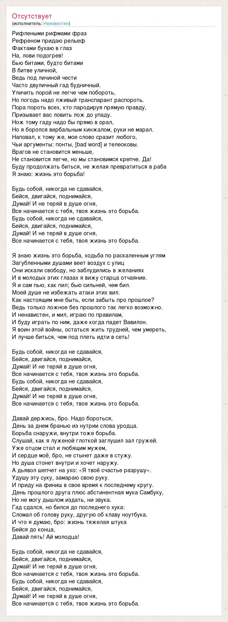 Рифлеными рифмами фраз Рефреном придаю рельеф Фактами бухаю в глаз На, лови подогрев! Бью битами, будто битами В битве уличной, Ведь под личиной чести Часто двуличный гад будничный. Уличить порой не легче чем побороть, Но погодь надо лживый транспарант распороть. Пора пороть всех, кто пародируя прямую правду, Призывает вас ловить лож до упаду. Нож тому гаду надо бы прямо в орал, Но я боролся вербальным кинжалом, руки не марал. Наповал, к тому же, мое слово сразит любого, Чьи аргументы: понты, [bad word] и телеоковы. Врагов не становится меньше, Не становится легче, но мы становимся крепче. Да! Буду продолжать биться, не желая превратиться в раба Я знаю: жизнь это борьба! Будь собой, никогда не сдавайся, Бейся, двигайся, поднимайся, Думай! И не теряй в душе огня, Все начинается с тебя, твоя жизнь это борьба. Будь собой, никогда не сдавайся, Бейся, двигайся, поднимайся, Думай! И не теряй в душе огня, Все начинается с тебя, твоя жизнь это борьба. Я знаю жизнь это борьба, ходьба по раскаленным углям Загубленными душами веет воздух с улиц Они искали свободу, но заблудились в желаниях И в молодых этих глазах я вижу старца отчаяние. Я и сам пью, как пил; бью сильней, чем бил. Моей душе не избежать атаки этих вил. Как настоящим мне быть, если забыть про прошлое? Ведь только ложное без прошлого так легко возможно. И ненавистен, и мил, играю по правилам, И буду играть по ним, даже когда падет Вавилон. Я воин этой войны, остаться жить трудней, чем умереть, И лучше биться, чем под плеть идти в сеть! Будь собой, никогда не сдавайся, Бейся, двигайся, поднимайся, Думай! И не теряй в душе огня, Все начинается с тебя, твоя жизнь это борьба. Будь собой, никогда не сдавайся, Бейся, двигайся, поднимайся, Думай! И не теряй в душе огня, Все начинается с тебя, твоя жизнь это борьба. Давай держись, бро. Надо бороться, День за днем бранью из нутрии слова уродца. Борьба снаружи, внутри тоже борьба. Слушай, как я луженой глоткой заглушил зал гружей. Уже отцом стал и любящим мужем, И сердце моё, бро, не стынет даже в стужу. Но душа стонет внутри и хочет наружу. А дьявол шепчет на ухо: «Я твоё счастье разрушу». Удушу эту суку, замараю свою руку. И приду на финиш в свое время к последнему кругу. День прошлого друга плюс абстинентная мука Самбуку, Но не могу дышлом издать, ни звука. Гад сдался, но бился до последнего хука: Сломал об голову руку, другую об клаву ноутбука. И что я думаю, бро: жизнь тяжелая штука Бейся до конца, Давай пять! Ай молодца! Будь собой, никогда не сдавайся, Бейся, двигайся, поднимайся, Думай! И не теряй в душе огня, Все начинается с тебя, твоя жизнь это борьба. Будь собой, никогда не сдавайся, Бейся, двигайся, поднимайся, Думай! И не теряй в душе огня, Все начинается с тебя, твоя жизнь это борьба.