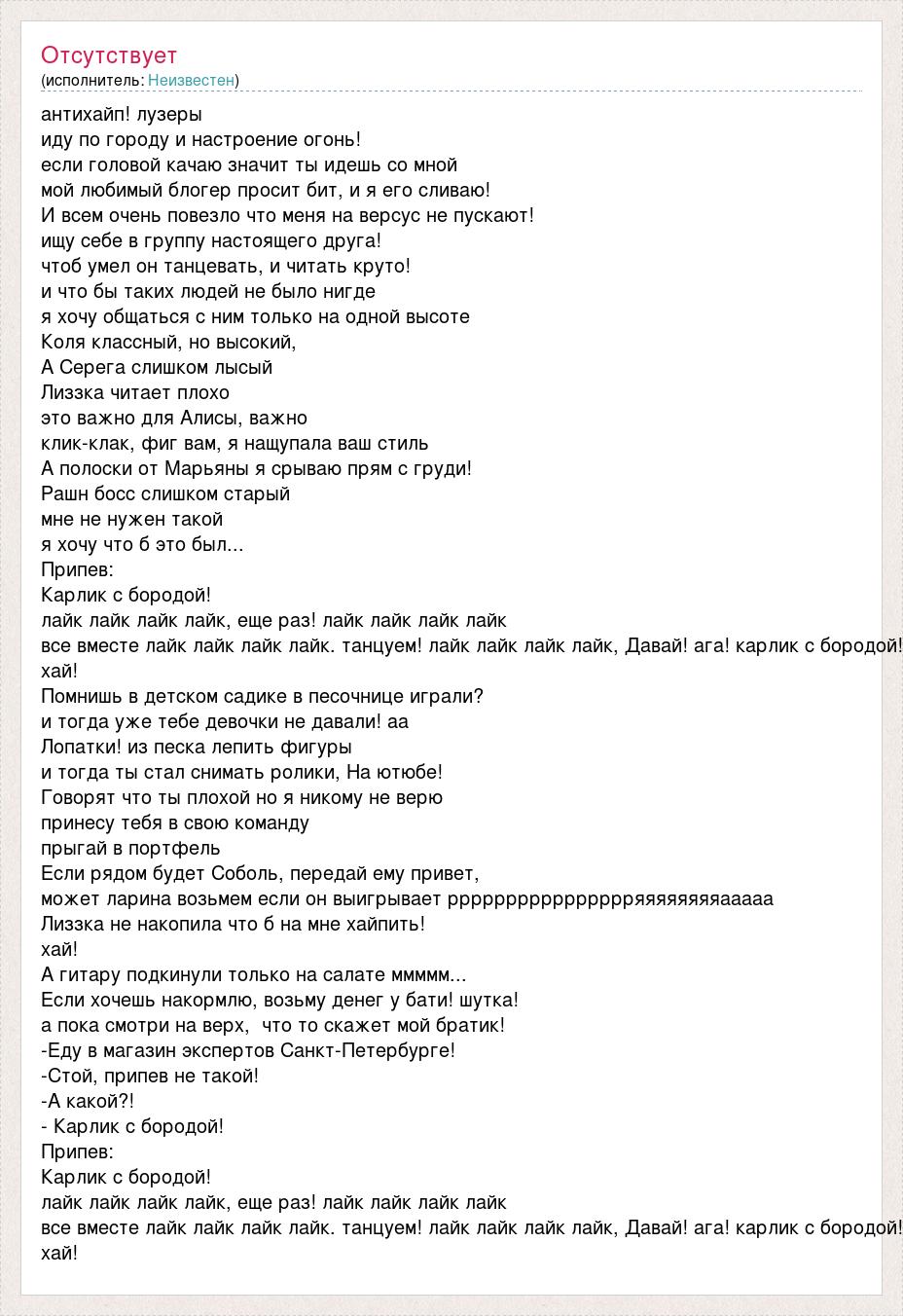 антихайп! лузеры иду по городу и настроение огонь! если головой качаю значит ты идешь со мной мой любимый блогер просит бит, и я его сливаю! И всем очень повезло что меня на версус не пускают! ищу себе в группу настоящего друга! чтоб умел он танцевать, и читать круто! и что бы таких людей не было нигде я хочу общаться с ним только на одной высоте Коля классный, но высокий, А Серега слишком лысый Лиззка читает плохо это важно для Алисы, важно клик-клак, фиг вам, я нащупала ваш стиль А полоски от Марьяны я срываю прям с груди! Рашн босс слишком старый мне не нужен такой я хочу что б это был... Припев: Карлик с бородой! лайк лайк лайк лайк, еще раз! лайк лайк лайк лайк все вместе лайк лайк лайк лайк. танцуем! лайк лайк лайк лайк, Давай! ага! карлик с бородой! хай! Помнишь в детском садике в песочнице играли? и тогда уже тебе девочки не давали! аа Лопатки! из песка лепить фигуры и тогда ты стал снимать ролики, На ютюбе! Говорят что ты плохой но я никому не верю принесу тебя в свою команду прыгай в портфель Если рядом будет Соболь, передай ему привет, может ларина возьмем если он выигрывает рррррррррррррррряяяяяяяяааааа Лиззка не накопила что б на мне хайпить! хай! А гитару подкинули только на салате ммммм... Если хочешь накормлю, возьму денег у бати! шутка! а пока смотри на верх, что то скажет мой братик! -Еду в магазин экспертов Санкт-Петербурге! -Стой, припев не такой! -А какой?! - Карлик с бородой! Припев: Карлик с бородой! лайк лайк лайк лайк, еще раз! лайк лайк лайк лайк все вместе лайк лайк лайк лайк. танцуем! лайк лайк лайк лайк, Давай! ага! карлик с бородой! хай!