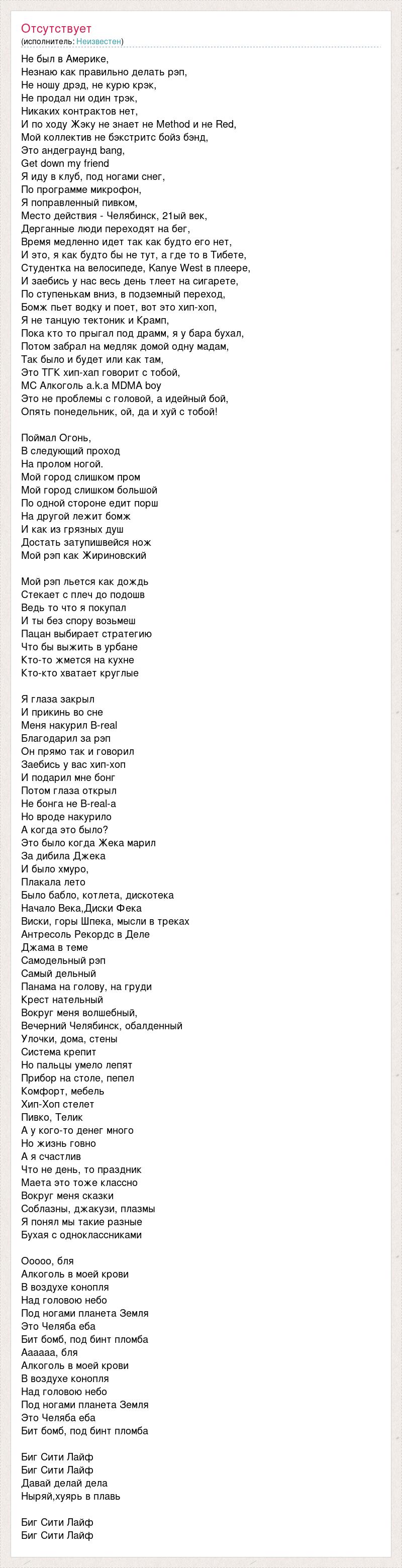 Не был в Америке, Незнаю как правильно делать рэп, Не ношу дрэд, не курю крэк, Не продал ни один трэк, Никаких контрактов нет, И по ходу Жэку не знает не Method и не Red, Мой коллектив не бэкстритс бойз бэнд, Это андеграунд bang, Get down my friend Я иду в клуб, под ногами снег, По программе микрофон, Я поправленный пивком, Место действия - Челябинск, 21ый век, Дерганные люди переходят на бег, Время медленно идет так как будто его нет, И это, я как будто бы не тут, а где то в Тибете, Студентка на велосипеде, Kanye West в плеере, И заебись у нас весь день тлеет на сигарете, По ступенькам вниз, в подземный переход, Бомж пьет водку и поет, вот это хип-хоп, Я не танцую тектоник и Крамп, Пока кто то прыгал под драмм, я у бара бухал, Потом забрал на медляк домой одну мадам, Так было и будет или как там, Это ТГК хип-хап говорит с тобой, MC Алкоголь a.k.a MDMA boy Это не проблемы с головой, а идейный бой, Опять понедельник, ой, да и хуй с тобой! Поймал Огонь, В следующий проход На пролом ногой. Мой город слишком пром Мой город слишком большой По одной стороне едит порш На другой лежит бомж И как из грязных душ Достать затупишвейся нож Мой рэп как Жириновский Мой рэп льется как дождь Стекает с плеч до подошв Ведь то что я покупал И ты без спору возьмеш Пацан выбирает стратегию Что бы выжить в урбане Кто-то жмется на кухне Кто-кто хватает круглые Я глаза закрыл И прикинь во сне Меня накурил B-real Благодарил за рэп Он прямо так и говорил Заебись у вас хип-хоп И подарил мне бонг Потом глаза открыл Не бонга не B-real-а Но вроде накурило А когда это было? Это было когда Жека марил За дибила Джека И было хмуро, Плакала лето Было бабло, котлета, дискотека Начало Века,Диски Фека Виски, горы Шпека, мысли в треках Антресоль Рекордс в Деле Джама в теме Самодельный рэп Самый дельный Панама на голову, на груди Крест нательный Вокруг меня волшебный, Вечерний Челябинск, обалденный Улочки, дома, стены Система крепит Но пальцы умело лепят Прибор на столе, пепел Комфорт, мебель Хип-Хоп стелет Пивко, Телик А у кого-то денег много Но жизнь говно А я счастлив Что не день, то праздник Маета это тоже классно Вокруг меня сказки Соблазны, джакузи, плазмы Я понял мы такие разные Бухая с одноклассниками Ооооо, бля Алкоголь в моей крови В воздухе конопля Над головою небо Под ногами планета Земля Это Челяба еба Бит бомб, под бинт пломба Аааааа, бля Алкоголь в моей крови В воздухе конопля Над головою небо Под ногами планета Земля Это Челяба еба Бит бомб, под бинт пломба Биг Сити Лайф Биг Сити Лайф Давай делай дела Ныряй,хуярь в плавь Биг Сити Лайф Биг Сити Лайф
