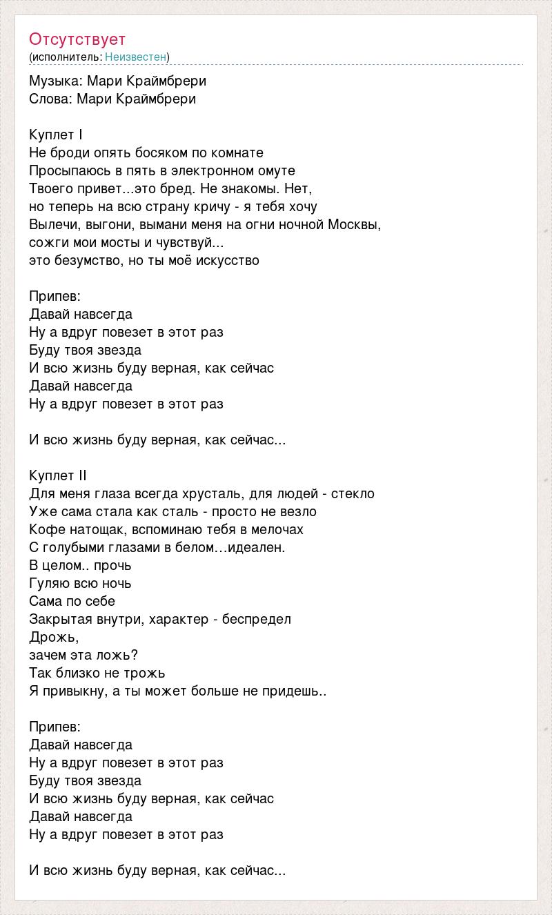 Музыка: Мари Краймбрери Слова: Мари Краймбрери Куплет I Не броди опять босяком по комнате Просыпаюсь в пять в электронном омуте Твоего привет...это бред. Не знакомы. Нет, но теперь на всю страну кричу - я тебя хочу Вылечи, выгони, вымани меня на огни ночной Москвы, сожги мои мосты и чувствуй... это безумство, но ты моё искусство Припев: Давай навсегда Ну а вдруг повезет в этот раз Буду твоя звезда И всю жизнь буду верная, как сейчас Давай навсегда Ну а вдруг повезет в этот раз И всю жизнь буду верная, как сейчас... Куплет II Для меня глаза всегда хрусталь, для людей - стекло Уже сама стала как сталь - просто не везло Кофе натощак, вспоминаю тебя в мелочах С голубыми глазами в белом…идеален. В целом.. прочь Гуляю всю ночь Сама по себе Закрытая внутри, характер - беспредел Дрожь, зачем эта ложь? Так близко не трожь Я привыкну, а ты может больше не придешь.. Припев: Давай навсегда Ну а вдруг повезет в этот раз Буду твоя звезда И всю жизнь буду верная, как сейчас Давай навсегда Ну а вдруг повезет в этот раз И всю жизнь буду верная, как сейчас...