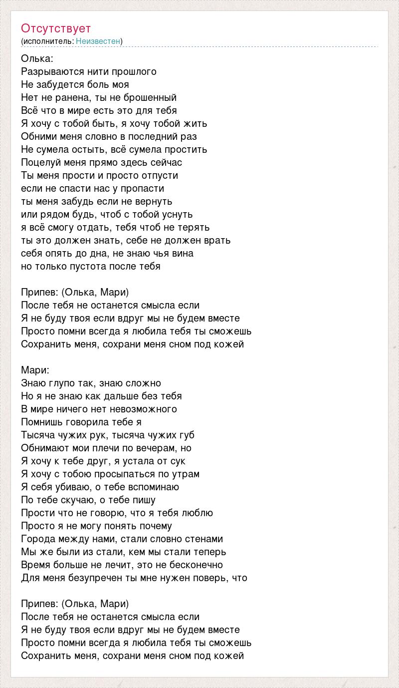 Олька: Разрываются нити прошлого Не забудется боль моя Нет не ранена, ты не брошенный Всё что в мире есть это для тебя Я хочу с тобой быть, я хочу тобой жить Обними меня словно в последний раз Не сумела остыть, всё сумела простить Поцелуй меня прямо здесь сейчас Ты меня прости и просто отпусти если не спасти нас у пропасти ты меня забудь если не вернуть или рядом будь, чтоб с тобой уснуть я всё смогу отдать, тебя чтоб не терять ты это должен знать, себе не должен врать себя опять до дна, не знаю чья вина но только пустота после тебя Припев: (Олька, Мари) После тебя не останется смысла если Я не буду твоя если вдруг мы не будем вместе Просто помни всегда я любила тебя ты сможешь Сохранить меня, сохрани меня сном под кожей Мари: Знаю глупо так, знаю сложно Но я не знаю как дальше без тебя В мире ничего нет невозможного Помнишь говорила тебе я Тысяча чужих рук, тысяча чужих губ Обнимают мои плечи по вечерам, но Я хочу к тебе друг, я устала от сук Я хочу с тобою просыпаться по утрам Я себя убиваю, о тебе вспоминаю По тебе скучаю, о тебе пишу Прости что не говорю, что я тебя люблю Просто я не могу понять почему Города между нами, стали словно стенами Мы же были из стали, кем мы стали теперь Время больше не лечит, это не бесконечно Для меня безупречен ты мне нужен поверь, что Припев: (Олька, Мари) После тебя не останется смысла если Я не буду твоя если вдруг мы не будем вместе Просто помни всегда я любила тебя ты сможешь Сохранить меня, сохрани меня сном под кожей