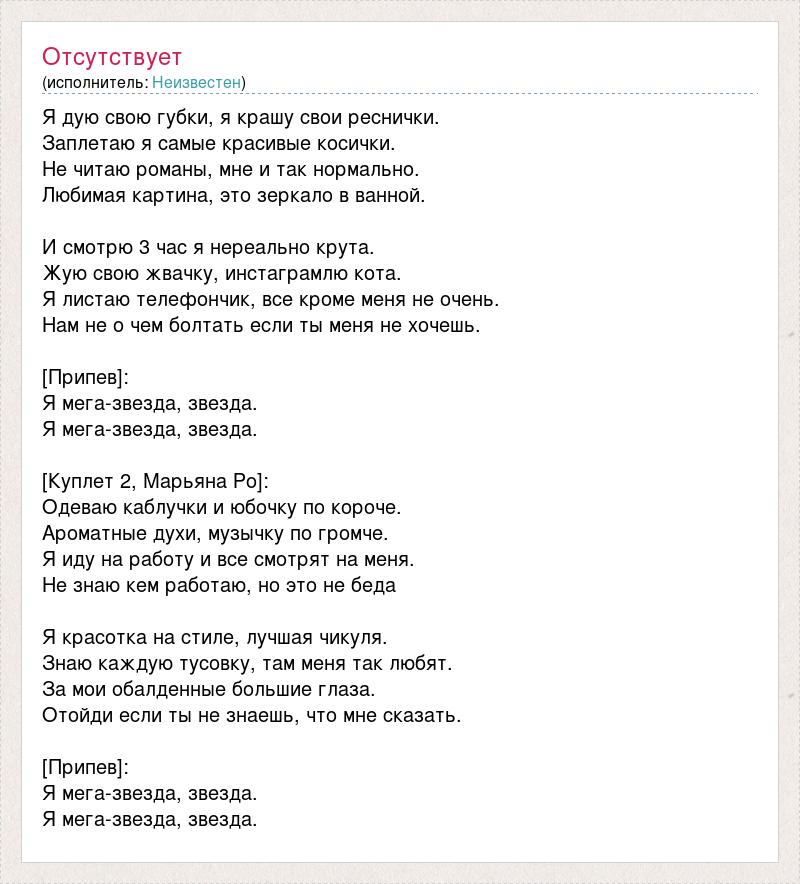 Я дую свою губки, я крашу свои реснички. Заплетаю я самые красивые косички. Не читаю романы, мне и так нормально. Любимая картина, это зеркало в ванной. И смотрю 3 час я нереально крута. Жую свою жвачку, инстаграмлю кота. Я листаю телефончик, все кроме меня не очень. Нам не о чем болтать если ты меня не хочешь. [Припев]: Я мега-звезда, звезда. Я мега-звезда, звезда. [Куплет 2, Марьяна Ро]: Одеваю каблучки и юбочку по короче. Ароматные духи, музычку по громче. Я иду на работу и все смотрят на меня. Не знаю кем работаю, но это не беда Я красотка на стиле, лучшая чикуля. Знаю каждую тусовку, там меня так любят. За мои обалденные большие глаза. Отойди если ты не знаешь, что мне сказать. [Припев]: Я мега-звезда, звезда. Я мега-звезда, звезда.