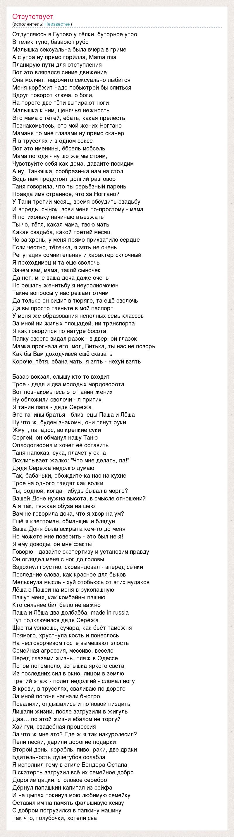 Отдупляюсь в Бутово у тёлки, буторное утро В телик тупо, базарю грубо Малышка сексуальна была вчера в гриме А с утра ну прямо горилла, Mama mia Планирую пути для отступления Вот это вляпался синие движение Она молчит, нарочито сексуально лыбится Меня корёжит надо побыстрей бы слиться Вдруг поворот ключа, о боги, На пороге две тёти вытирают ноги Малышка к ним, щенячья нежность Это мама с тётей, ебать, какая прелесть Познакомьтесь, это мой жених Ноггано Маманя по мне глазами ну прямо сканер Я в труселях и в одном соксе Вот это именины, ёбсель мобсель Мама погодя - ну шо же мы стоим, Чувствуйте себя как дома, давайте посидим А ну, Танюшка, сообрази-ка нам на стол Ведь нам предстоит долгий разговор Таня говорила, что ты серьёзный парень Правда имя странное, что за Ноггано? У Тани третий месяц, время обсудить свадьбу И впредь, сынок, зови меня по-простому - мама Я потихоньку начинаю въезжать Ты чо, тётя, какая мама, твою мать Какая свадьба, какой третий месяц Чо за хрень, у меня прямо прихватило сердце Если честно, тётечка, я зять не очень Репутация сомнительная и характер склочный Я проходимец и та еще сволочь Зачем вам, мама, такой сыночек Да нет, мне ваша доча даже очень Но решать женитьбу я неуполномочен Такие вопросы у нас решает отчим Да только он сидит в тюряге, та ещё сволочь Да вы просто гляньте в мой паспорт У меня же образования неполных семь классов За мной ни жилых площадей, ни транспорта Я как говорится по натуре босота Папку своего видал разок - в дверной глазок Мамка прогнала его, мол, Витька, ты нас не позорь Как бы Вам доходчивей ещё сказать Короче, тётя, ебана мать, я зять - нехуй взять Базар-вокзал, слышу кто-то входит Трое - дядя и два молодых мордоворота Вот познакомьтесь это танин жених Ну обложили сволочи - я притих Я танин папа - дядя Сережа Это танины братья - близнецы Паша и Лёша Ну что ж, будем знакомы, они тянут руки Жмут, пападос, во крепкие суки Сергей, он обманул нашу Таню Оплодотворил и хочет её оставить Таня напоказ, сука, плачет у окна Всхлипывает жалко: "Что мне делать, па!" Дядя Сережа недолго думаю Так, бабаньки, обождите-ка нас на кухне Трое на одного глядят как волки Ты, родной, когда-нибудь бывал в морге? Вашей Доне нужна высота, в смысле отношений А я так, тяжкая обуза на шею Вам не говорила доча, что я хвор на ум? Ещё я клептоман, обманщик и блядун Ваша Доня была вскрыта кем-то до меня Но можете мне поверить - это был не я! Я ему доводы, он мне факты Говорю - давайте экспертизу и установим правду Он оглядел меня с ног до головы Вздохнул грустно, скомандовал - вперед сынки Последние слова, как красное для быков Мелькнула мысль - хуй отобьюсь от этих мудаков Лёша с Пашей на меня в рукопашную Пашут меня, как комбайны пашню Кто сильнее бил было не важно Паша и Лёша два долбаёба, made in russia Тут подключился дядя Серёжа Щас ты узнаешь, сучара, как бьёт таможня Прямого, хрустнула кость и понеслось На несговорчивом госте вымещают злость Семейная агрессия, мессиво, весело Перед глазами жизнь, пляж в Одессе Потом потемнело, вспышка яркого света Из последних сил в окно, лицом в землю Третий этаж - полет недолгий - сломал ногу В крови, в труселях, сваливаю по дороге За мной погоня нагнали быстро Повалили, отдышались и по новой пиздить Лишали жизни, после загрузили в жигуль Даа… по этой жизни ебалом не торгуй Хай гуй, свадебная процессия За что ж мне это? Где 