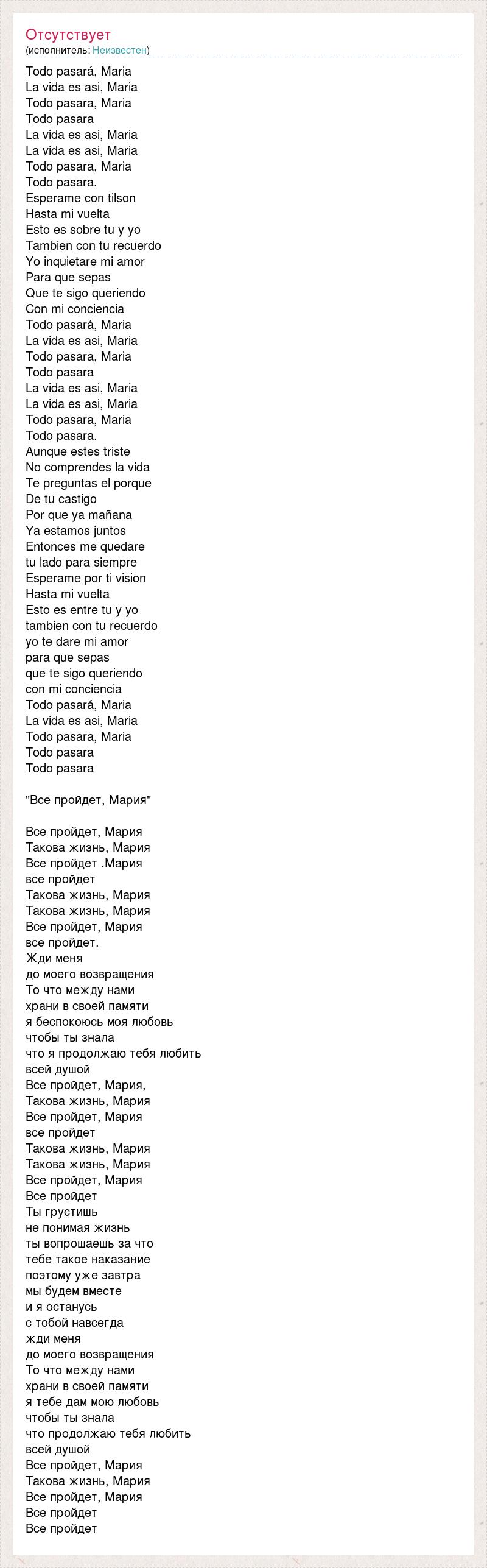 Todo pasará, Maria La vida es asi, Maria Todo pasara, Maria Todo pasara La vida es asi, Maria La vida es asi, Maria Todo pasara, Maria Todo pasara. Esperame con tilson Hasta mi vuelta Esto es sobre tu y yo Tambien con tu recuerdo Yo inquietare mi amor Para que sepas Que te sigo queriendo Con mi conciencia Todo pasará, Maria La vida es asi, Maria Todo pasara, Maria Todo pasara La vida es asi, Maria La vida es asi, Maria Todo pasara, Maria Todo pasara. Aunque estes triste No comprendes la vida Te preguntas el porque De tu castigo Por que ya mañana Ya estamos juntos Entonces me quedare tu lado para siempre Esperame por ti vision Hasta mi vuelta Esto es entre tu y yo tambien con tu recuerdo yo te dare mi amor para que sepas que te sigo queriendo con mi conciencia Todo pasará, Maria La vida es asi, Maria Todo pasara, Maria Todo pasara Todo pasara "Все пройдет, Мария" Все пройдет, Мария Такова жизнь, Мария Все пройдет .Мария все пройдет Такова жизнь, Мария Такова жизнь, Мария Все пройдет, Мария все пройдет. Жди меня до моего возвращения То что между нами храни в своей памяти я беспокоюсь моя любовь чтобы ты знала что я продолжаю тебя любить всей душой Все пройдет, Мария, Такова жизнь, Мария Все пройдет, Мария все пройдет Такова жизнь, Мария Такова жизнь, Мария Все пройдет, Мария Все пройдет Ты грустишь не понимая жизнь ты вопрошаешь за что тебе такое наказание поэтому уже завтра мы будем вместе и я останусь с тобой навсегда жди меня до моего возвращения То что между нами храни в своей памяти я тебе дам мою любовь чтобы ты знала что продолжаю тебя любить всей душой Все пройдет, Мария Такова жизнь, Мария Все пройдет, Мария Все пройдет Все пройдет