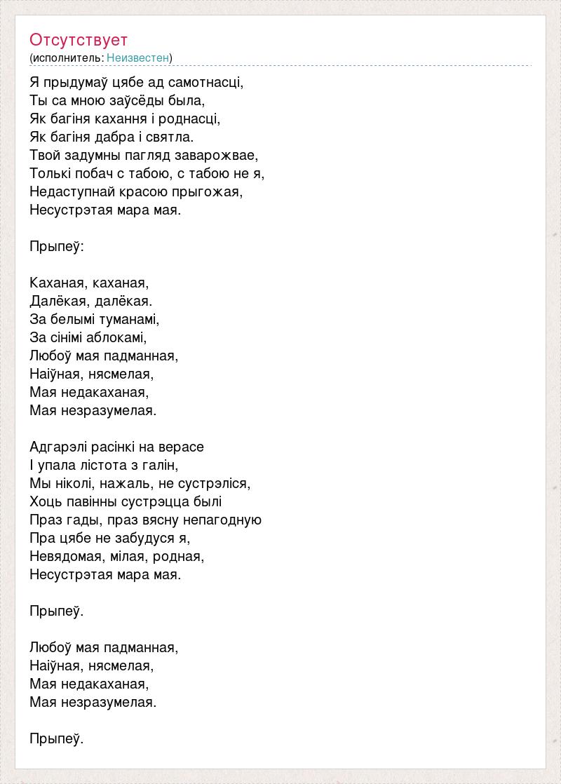 Я прыдумаў цябе ад самотнасці, Ты са мною заўсёды была, Як багіня кахання і роднасці, Як багіня дабра і святла. Твой задумны пагляд заварожвае, Толькі побач с табою, с табою не я, Недаступнай красою прыгожая, Несустрэтая мара мая. Прыпеў: Каханая, каханая, Далёкая, далёкая. За белымі туманамі, За сінімі аблокамі, Любоў мая падманная, Наіўная, нясмелая, Мая недакаханая, Мая незразумелая. Адгарэлі расінкі на верасе І упала лістота з галін, Мы ніколі, нажаль, не сустрэліся, Хоць павінны сустрэцца былі Праз гады, праз вясну непагодную Пра цябе не забудуся я, Невядомая, мілая, родная, Несустрэтая мара мая. Прыпеў. Любоў мая падманная, Наіўная, нясмелая, Мая недакаханая, Мая незразумелая. Прыпеў.