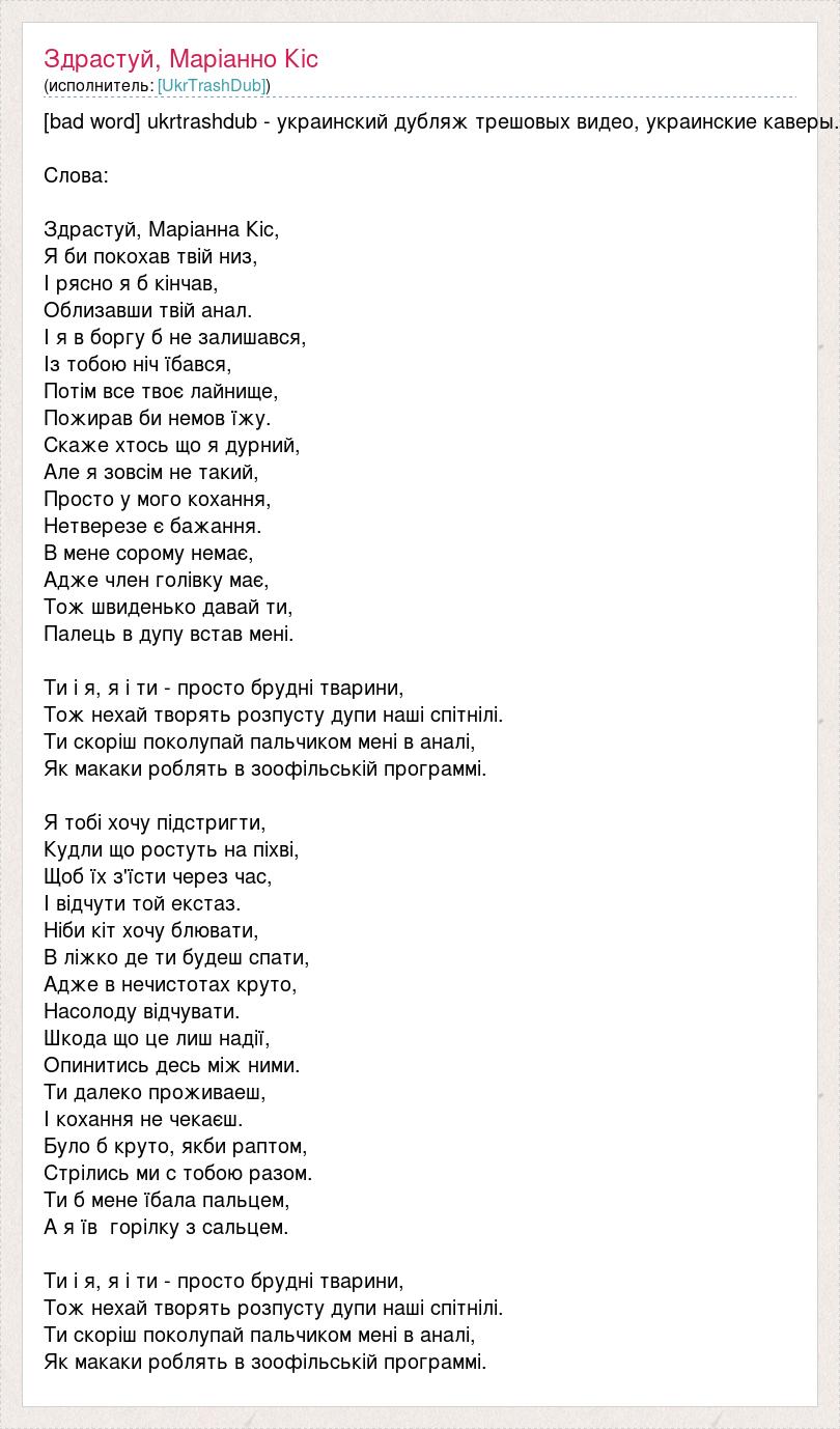 [bad word] ukrtrashdub - украинский дубляж трешовых видео, украинские каверы. Слова: Здрастуй, Маріанна Кіс, Я би покохав твій низ, І рясно я б кінчав, Облизавши твій анал. І я в боргу б не залишався, Із тобою ніч їбався, Потім все твоє лайнище, Пожирав би немов їжу. Скаже хтось що я дурний, Але я зовсім не такий, Просто у мого кохання, Нетверезе є бажання. В мене сорому немає, Адже член голівку має, Тож швиденько давай ти, Палець в дупу встав мені. Ти і я, я і ти - просто брудні тварини, Тож нехай творять розпусту дупи наші спітнілі. Ти скоріш поколупай пальчиком мені в аналі, Як макаки роблять в зоофільській программі. Я тобі хочу підстригти, Кудли що ростуть на піхві, Щоб їх з'їсти через час, І відчути той екстаз. Ніби кіт хочу блювати, В ліжко де ти будеш спати, Адже в нечистотах круто, Насолоду відчувати. Шкода що це лиш надії, Опинитись десь між ними. Ти далеко проживаеш, І кохання не чекаєш. Було б круто, якби раптом, Стрілись ми с тобою разом. Ти б мене їбала пальцем, А я їв горілку з сальцем. Ти і я, я і ти - просто брудні тварини, Тож нехай творять розпусту дупи наші спітнілі. Ти скоріш поколупай пальчиком мені в аналі, Як макаки роблять в зоофільській программі.