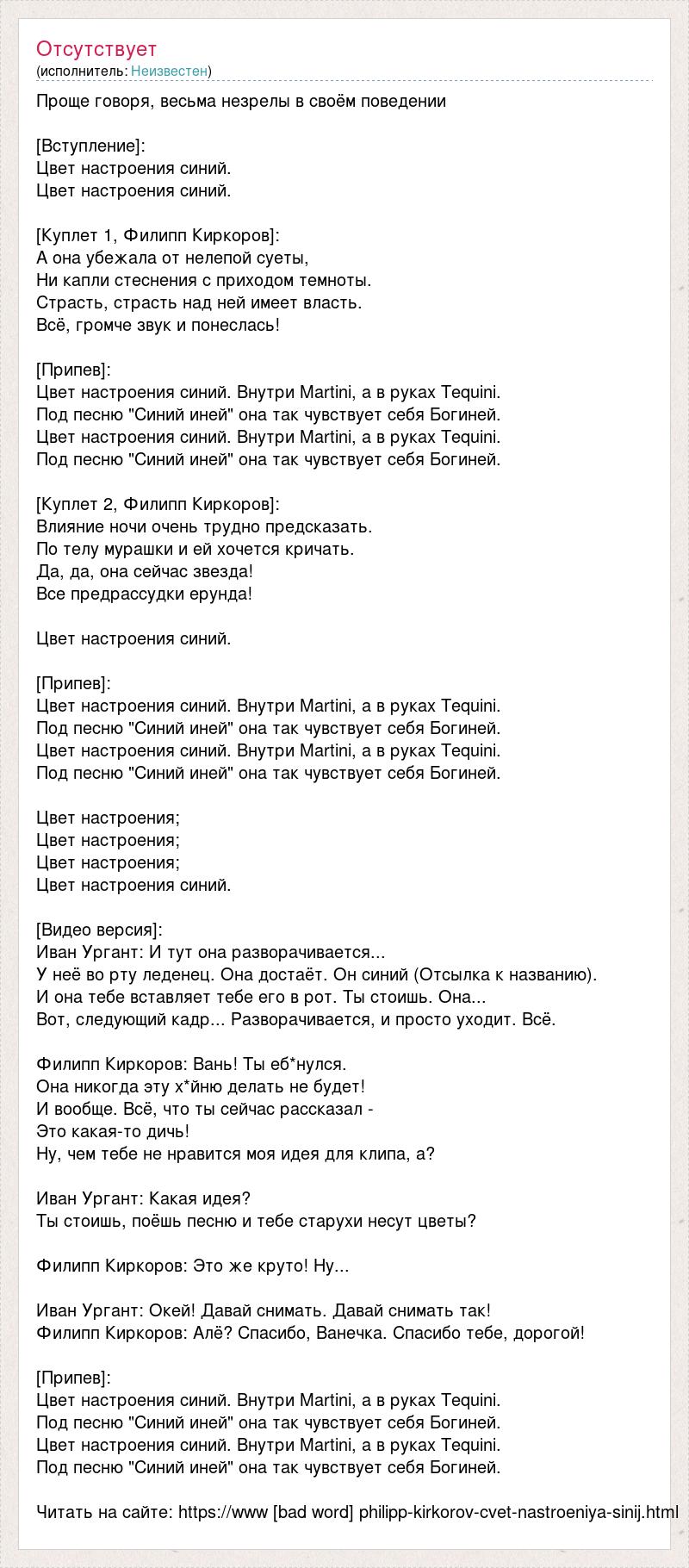 Проще говоря, весьма незрелы в своём поведении [Вступление]: Цвет настроения синий. Цвет настроения синий. [Куплет 1, Филипп Киркоров]: А она убежала от нелепой суеты, Ни капли стеснения с приходом темноты. Страсть, страсть над ней имеет власть. Всё, громче звук и понеслась! [Припев]: Цвет настроения синий. Внутри Martini, а в руках Tequini. Под песню "Синий иней" она так чувствует себя Богиней. Цвет настроения синий. Внутри Martini, а в руках Tequini. Под песню "Синий иней" она так чувствует себя Богиней. [Куплет 2, Филипп Киркоров]: Влияние ночи очень трудно предсказать. По телу мурашки и ей хочется кричать. Да, да, она сейчас звезда! Все предрассудки ерунда! Цвет настроения синий. [Припев]: Цвет настроения синий. Внутри Martini, а в руках Tequini. Под песню "Синий иней" она так чувствует себя Богиней. Цвет настроения синий. Внутри Martini, а в руках Tequini. Под песню "Синий иней" она так чувствует себя Богиней. Цвет настроения; Цвет настроения; Цвет настроения; Цвет настроения синий. [Видео версия]: Иван Ургант: И тут она разворачивается... У неё во рту леденец. Она достаёт. Он синий (Отсылка к названию). И она тебе вставляет тебе его в рот. Ты стоишь. Она... Вот, следующий кадр... Разворачивается, и просто уходит. Всё. Филипп Киркоров: Вань! Ты еб*нулся. Она никогда эту х*йню делать не будет! И вообще. Всё, что ты сейчас рассказал - Это какая-то дичь! Ну, чем тебе не нравится моя идея для клипа, а? Иван Ургант: Какая идея? Ты стоишь, поёшь песню и тебе старухи несут цветы? Филипп Киркоров: Это же круто! Ну... Иван Ургант: Окей! Давай снимать. Давай снимать так! Филипп Киркоров: Алё? Спасибо, Ванечка. Спасибо тебе, дорогой! [Припев]: Цвет настроения синий. Внутри Martini, а в руках Tequini. Под песню "Синий иней" она так чувствует себя Богиней. Цвет настроения синий. Внутри Martini, а в руках Tequini. Под песню "Синий иней" она так чувствует себя Богиней. Читать на сайте: https://www [bad word] philipp-kirkorov-cvet-nastroeniya-sinij.html