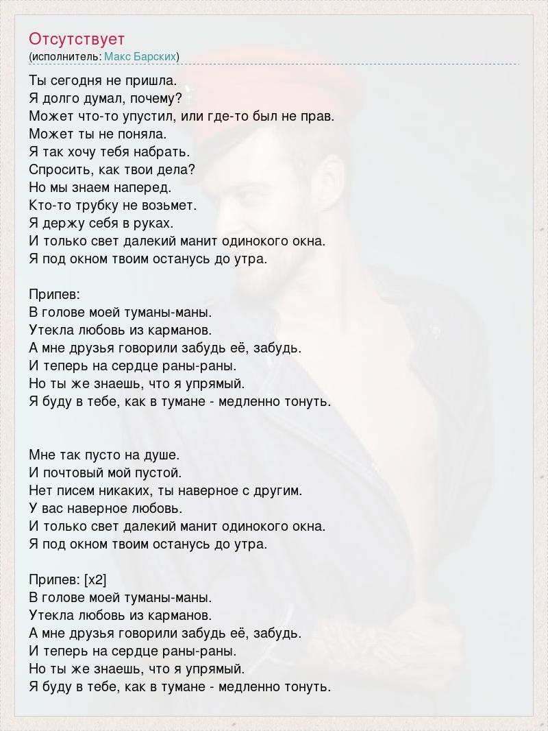 Ты сегодня не пришла. Я долго думал, почему? Может что-то упустил, или где-то был не прав. Может ты не поняла. Я так хочу тебя набрать. Спросить, как твои дела? Но мы знаем наперед. Кто-то трубку не возьмет. Я держу себя в руках. И только свет далекий манит одинокого окна. Я под окном твоим останусь до утра. Припев: В голове моей туманы-маны. Утекла любовь из карманов. А мне друзья говорили забудь её, забудь. И теперь на сердце раны-раны. Но ты же знаешь, что я упрямый. Я буду в тебе, как в тумане - медленно тонуть. Мне так пусто на душе. И почтовый мой пустой. Нет писем никаких, ты наверное с другим. У вас наверное любовь. И только свет далекий манит одинокого окна. Я под окном твоим останусь до утра. Припев: [х2] В голове моей туманы-маны. Утекла любовь из карманов. А мне друзья говорили забудь её, забудь. И теперь на сердце раны-раны. Но ты же знаешь, что я упрямый. Я буду в тебе, как в тумане - медленно тонуть.