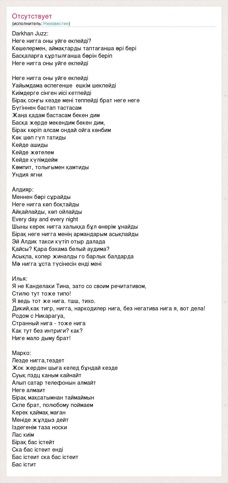 Darkhan Juzz: Неге нигга оны уйге екпейді? Көшелермен, аймақтарды таптағанша əрі бері Басқаларға құртылғанша бəрін беріп Неге нигга оны уйге екпейді Неге нигга оны уйге екпейді Уайымдама өспегенше ешкім шекпейді Киімдерге сінген иісі кетпейді Бірақ соңғы кезде мені теппейді брат неге неге Бүгіннен бастап тастасам Жаңа қадам бастасам бекен дим Басқа жерде мекендим бекен дим, Бiрак көріп алсам ондай ойга көнбим Көк шөп гүл татиды Кейде ашиды Кейде жөтелем Кейде күлімдейм Кəмпит, толығымен қамтиды Ундия яғни Алдияр: Меннен бəрі сұрайды Неге нигга көп боқтайды Айқайлайды, көп ойлайды Every day and every night Шыны керек нигга халыққа бұл өнерім ұнайды Бірақ неге нигга менің армандарым асықпайды Эй Алдик такси күтіп отыр далада Қайсы? Қара бэхама белый аудима? Асықпа, копер жиналды го барлык балдарда Мə нигга ұста түсінесін енді мені Илья: Я не Канделаки Тина, зато со своим речитативом, Стилю тут тоже типо! Я ведь тот же нига. тшш, тихо. Дикий,как тигр, нигга, наркодилер нига, без негатива нига я, вот дела! Родом с Никарагуа, Странный нига - тоже нига Как тут без интриги? как? Ниге мало дыму брат! Марко: Лезде нигга,тездет Жок жерден шыға келед бұндай кезде Суық пздц каным кайнайт Алып сатар телефонын алмайт Неге алмаит Бірақ мақсатымнан таймаймын Скпе брат, полюбому поймаем Керек қаймақ маған Меніде жұлдыз дейт Іздегенім таза носки Лас киім Бірақ бас істейт Ска бас істеит енді Бас істеит ска бас істеит Бас істит