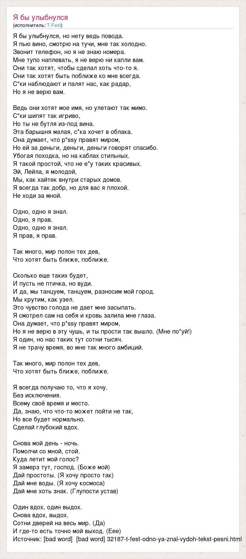 Я бы улыбнулся, но нету ведь повода. Я пью вино, смотрю на тучи, мне так холодно. Звонит телефон, но я не знаю номера. Мне тупо наплевать, я не верю ни капли вам. Они так хотят, чтобы сделал хоть что-то я. Они так хотят быть поближе ко мне всегда. С*ки наблюдают и палят нас, как радар, Но я не верю вам. Ведь они хотят мое имя, но улетают так мимо. С*ки шипят так игриво, Но ты не бутля из-под вина. Эта барышня малая, с*ка хочет в облака. Она думает, что p*ssy правят миром, Но ей за деньги, деньги, деньги говорят спасибо. Убогая походка, но на каблах стильных. Я такой простой, что не е*у таких красивых. Эй, Лейла, я молодой, Мы, как хайтек внутри старых домов. Я всегда так добр, но для вас я плохой. Не ходи за мной. Одно, одно я знал. Одно, я прав. Одно, одно я знал. Я прав, я прав. Так много, мир полон тех дев, Что хотят быть ближе, поближе. Сколько еще таких будет, И пусть не птичка, но вуди. И да, мы танцуем, танцуем, разносим мой город. Мы крутим, как узел. Это чувство голода не дает мне засыпать. Я смотрел сам на себя и кровь залила мне глаза. Она думает, что p*ssy правят миром, Но я не верю в эту чушь, и ты прости так вышло. (Мне по*уй!) Я один, но нас таких тут сотни тысяч. Я не трачу время, во мне так много амбиций. Так много, мир полон тех дев, Что хотят быть ближе, поближе. Я всегда получаю то, что я хочу. Без исключения. Всему своё время и место. Да, знаю, что что-то может пойти не так, Но все будет нормально. Сделай глубокий вдох. Снова мой день - ночь. Помолчи со мной, стой. Куда летит мой голос? Я замерз тут, господ. (Боже мой) Дай простоты. (Я хочу просто так) Дай мне воды. (Я хочу космоса) Дай мне хоть знак. (Глупости устав) Один вдох, один выдох. Снова вдох, выдох. Сотни дверей на весь мир. (Да) И где-то есть точно мой выход. (Еее) Источник: [bad word] [bad word] 32187-t-fest-odno-ya-znal-vydoh-tekst-pesni.html