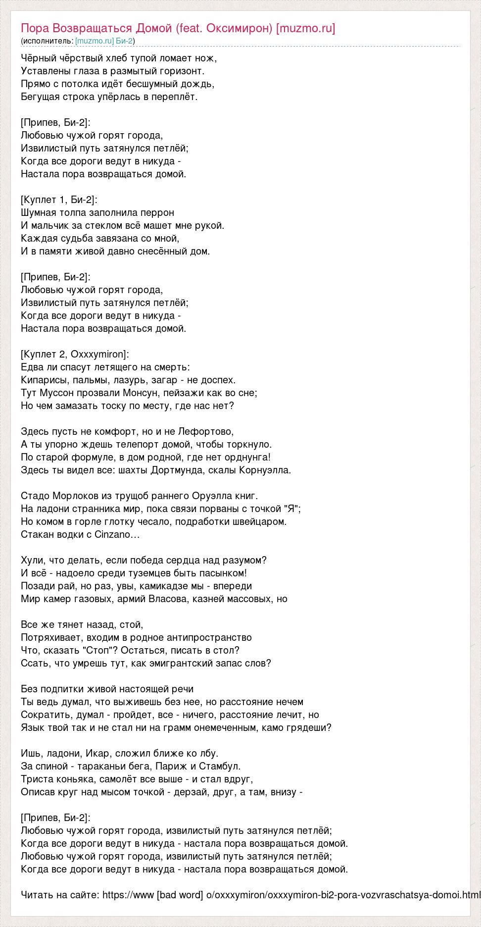 Чёрный чёрствый хлеб тупой ломает нож, Уставлены глаза в размытый горизонт. Прямо с потолка идёт бесшумный дождь, Бегущая строка упёрлась в переплёт. [Припев, Би-2]: Любовью чужой горят города, Извилистый путь затянулся петлёй; Когда все дороги ведут в никуда - Настала пора возвращаться домой. [Куплет 1, Би-2]: Шумная толпа заполнила перрон И мальчик за стеклом всё машет мне рукой. Каждая судьба завязана со мной, И в памяти живой давно снесённый дом. [Припев, Би-2]: Любовью чужой горят города, Извилистый путь затянулся петлёй; Когда все дороги ведут в никуда - Настала пора возвращаться домой. [Куплет 2, Oxxxymiron]: Едва ли спасут летящего на смерть: Кипарисы, пальмы, лазурь, загар - не доспех. Тут Муссон прозвали Монсун, пейзажи как во сне; Но чем замазать тоску по месту, где нас нет? Здесь пусть не комфорт, но и не Лефортово, А ты упорно ждешь телепорт домой, чтобы торкнуло. По старой формуле, в дом родной, где нет орднунга! Здесь ты видел все: шахты Дортмунда, скалы Корнуэлла. Стадо Морлоков из трущоб раннего Оруэлла книг. На ладони странника мир, пока связи порваны с точкой "Я"; Но комом в горле глотку чесало, подработки швейцаром. Стакан водки с Cinzano… Хули, что делать, если победа сердца над разумом? И всё - надоело среди туземцев быть пасынком! Позади рай, но раз, увы, камикадзе мы - впереди Мир камер газовых, армий Власова, казней массовых, но Все же тянет назад, стой, Потряхивает, входим в родное антипространство Что, сказать "Стоп"? Остаться, писать в стол? Ссать, что умрешь тут, как эмигрантский запас слов? Без подпитки живой настоящей речи Ты ведь думал, что выживешь без нее, но расстояние нечем Сократить, думал - пройдет, все - ничего, расстояние лечит, но Язык твой так и не стал ни на грамм онемеченным, камо грядеши? Ишь, ладони, Икар, сложил ближе ко лбу. За спиной - тараканьи бега, Париж и Стамбул. Триста коньяка, самолёт все выше - и стал вдруг, Описав круг над мысом точкой - дерзай, друг, а там, внизу - [Припев, Би-2]: Любовью чужой горят города, извилистый путь затянулся петлёй; Когда все дороги ведут в никуда - настала пора возвращаться домой. Любовью чужой горят города, извилистый путь затянулся петлёй; Когда все дороги ведут в никуда - настала пора возвращаться домой. Читать на сайте: https://www [bad word] o/oxxxymiron/oxxxymiron-bi2-pora-vozvraschatsya-domoi.html