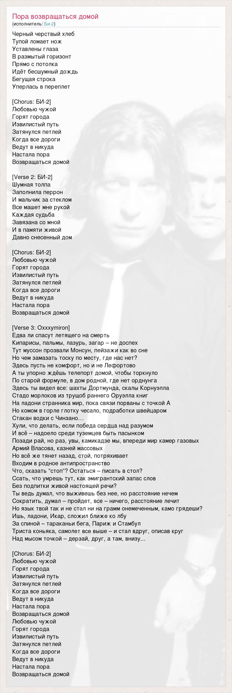 Черный черствый хлеб Тупой ломает нож Уставлены глаза В размытый горизонт Прямо с потолка Идёт бесшумный дождь Бегущая строка Уперлась в переплет [Chorus: БИ-2] Любовью чужой Горят города Извилистый путь Затянулся петлей Когда все дороги Ведут в никуда Настала пора Возвращаться домой [Verse 2: БИ-2] Шумная толпа Заполнила перрон И мальчик за стеклом Все машет мне рукой Каждая судьба Завязана со мной И в памяти живой Давно снесенный дом [Chorus: БИ-2] Любовью чужой Горят города Извилистый путь Затянулся петлей Когда все дороги Ведут в никуда Настала пора Возвращаться домой [Verse 3: Oxxxymiron] Едва ли спасут летящего на смерть Кипарисы, пальмы, лазурь, загар – не доспех Тут муссон прозвали Монсун, пейзажи как во сне Но чем замазать тоску по месту, где нас нет? Здесь пусть не комфорт, но и не Лефортово А ты упорно ждёшь телепорт домой, чтобы торкнуло По старой формуле, в дом родной, где нет орднунга Здесь ты видел все: шахты Дортмунда, скалы Корнуэлла Стадо морлоков из трущоб раннего Оруэлла книг На ладони странника мир, пока связи порваны с точкой А Но комом в горле глотку чесало, подработки швейцаром Стакан водки с Чинзано… Хули, что делать, если победа сердца над разумом И всё – надоело среди туземцев быть пасынком Позади рай, но раз, увы, камикадзе мы, впереди мир камер газовых Армий Власова, казней массовых Но всё же тянет назад, стой, потряхивает Входим в родное антипространство Что, сказать “стоп”? Остаться – писать в стол? Ссать, что умрешь тут, как эмигрантский запас слов Без подпитки живой настоящей речи? Ты ведь думал, что выживешь без нее, но расстояние нечем Сократить, думал – пройдет, все – ничего, расстояние лечит Но язык твой так и не стал ни на грамм онемеченным, камо грядеши? Ишь, ладони, Икар, сложил ближе ко лбу За спиной – тараканьи бега, Париж и Стамбул Триста коньяка, самолет все выше – и стал вдруг, описав круг Над мысом точкой – дерзай, друг, а там, внизу... [Chorus: БИ-2] Любовью чужой Горят города Извилистый путь Затянулся петлей Когда все дороги Ведут в никуда Настала пора Возвращаться домой Любовью чужой Горят города Извилистый путь Затянулся петлей Когда все дороги Ведут в никуда Настала пора Возвращаться домой