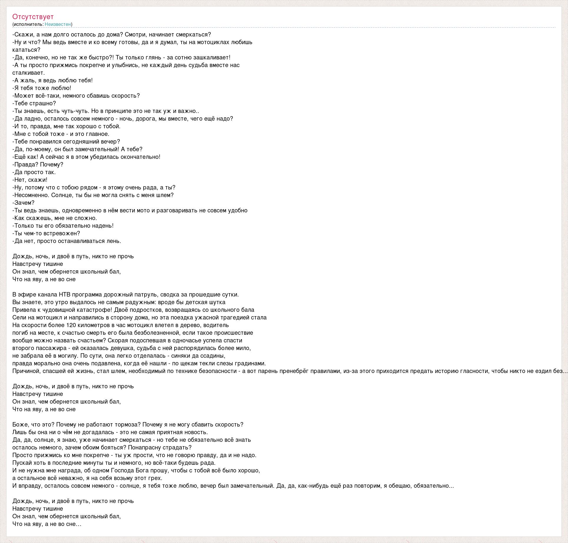 -Скажи, а нам долго осталось до дома? Смотри, начинает смеркаться? -Ну и что? Мы ведь вместе и ко всему готовы, да и я думал, ты на мотоциклах любишь кататься? -Да, конечно, но не так же быстро?! Ты только глянь - за сотню зашкаливает! -А ты просто прижмись покрепче и улыбнись, не каждый день судьба вместе нас сталкивает. -А жаль, я ведь люблю тебя! -Я тебя тоже люблю! -Может всё-таки, немного сбавишь скорость? -Тебе страшно? -Ты знаешь, есть чуть-чуть. Но в принципе это не так уж и важно.. -Да ладно, осталось совсем немного - ночь, дорога, мы вместе, чего ещё надо? -И то, правда, мне так хорошо с тобой. -Мне с тобой тоже - и это главное. -Тебе понравился сегодняшний вечер? -Да, по-моему, он был замечательный! А тебе? -Ещё как! А сейчас я в этом убедилась окончательно! -Правда? Почему? -Да просто так. -Нет, скажи! -Ну, потому что с тобою рядом - я этому очень рада, а ты? -Несомненно. Солнце, ты бы не могла снять с меня шлем? -Зачем? -Ты ведь знаешь, одновременно в нём вести мото и разговаривать не совсем удобно -Как скажешь, мне не сложно. -Только ты его обязательно надень! -Ты чем-то встревожен? -Да нет, просто останавливаться лень. Дождь, ночь, и двоё в путь, никто не прочь Навстречу тишине Он знал, чем обернется школьный бал, Что на яву, а не во сне В эфире канала НТВ программа дорожный патруль, сводка за прошедшие сутки. Вы знаете, это утро выдалось не самым радужным: вроде бы детская шутка Привела к чудовищной катастрофе! Двоё подростков, возвращаясь со школьного бала Сели на мотоцикл и направились в сторону дома, но эта поездка ужасной трагедией стала На скорости более 120 километров в час мотоцикл влетел в дерево, водитель погиб на месте, к счастью смерть его была безболезненной, если такое происшествие вообще можно назвать счастьем? Скорая подоспевшая в одночасье успела спасти второго пассажира - ей оказалась девушка, судьба с ней распорядилась более мило, не забрала её в могилу. По сути, она легко отделалась - синяки да ссадины, правда морально она очень подавлена, когда её нашли - по щекам текли слезы градинами. Причиной, спасшей ей жизнь, стал шлем, необходимый по технике безопасности - а вот парень пренебрёг правилами, из-за этого приходится предать историю гласности, чтобы никто не ездил без... Дождь, ночь, и двоё в путь, никто не прочь Навстречу тишине Он знал, чем обернется школьный бал, Что на яву, а не во сне Боже, что это? Почему не работают тормоза? Почему я не могу сбавить скорость? Лишь бы она ни о чём не догадалась - это не самая приятная новость. Да, да, солнце, я знаю, уже начинает смеркаться - но тебе не обязательно всё знать осталось немного, зачем обоим бояться? Понапрасну страдать? Просто прижмись ко мне покрепче - ты уж прости, что не говорю правду, да и не надо. Пускай хоть в последние минуты ты и немного, но всё-таки будешь рада. И не нужна мне награда, об одном Господа Бога прошу, чтобы с тобой всё было хорошо, а остальное всё неважно, я на себя возьму этот грех. И вправду, осталось совсем немного - солнце, я тебя тоже люблю, вечер был замечательный. Да, да, как-нибудь ещё раз повторим, я обещаю, обязательно... Дождь, ночь, и двоё в путь, никто не прочь Навстречу тишине Он знал, чем обернется школьный бал, Что на яву, а не во сне…