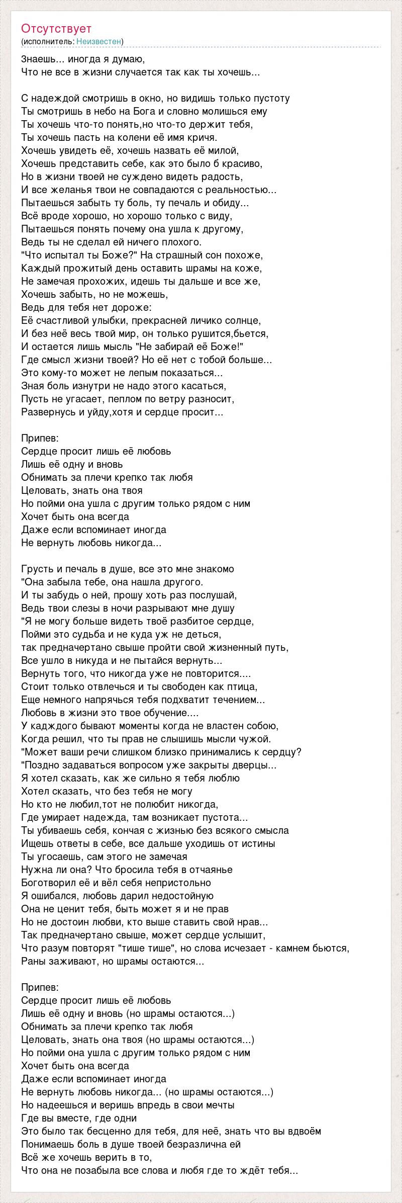 3наешь... иногда я думаю, Что не все в жизни случается так как ты хочешь... С надеждой смотришь в окно, но видишь только пустоту Ты смотришь в небо на Бога и словно молишься ему Ты хочешь что-то понять,но что-то держит тебя, Ты хочешь пасть на колени её имя кричя. Хочешь увидеть её, хочешь назвать её милой, Хочешь представить себе, как это было б красиво, Но в жизни твоей не суждено видеть радость, И все желанья твои не совпадаются с реальностью... Пытаешься забыть ту боль, ту печаль и обиду... Всё вроде хорошо, но хорошо только с виду, Пытаешься понять почему она ушла к другому, Ведь ты не сделал ей ничего плохого. "Что испытал ты Боже?" На страшный сон похоже, Каждый прожитый день оставить шрамы на коже, Не замечая прохожих, идешь ты дальше и все же, Хочешь забыть, но не можешь, Ведь для тебя нет дороже: Её счастливой улыбки, прекрасней личико солнце, И без неё весь твой мир, он только рушится,бьется, И остается лишь мысль "Не забирай её Боже!" Где смысл жизни твоей? Но её нет с тобой больше... Это кому-то может не лепым показаться... Зная боль изнутри не надо этого касаться, Пусть не угасает, пеплом по ветру разносит, Развернусь и уйду,хотя и сердце просит... Припев: Сердце просит лишь её любовь Лишь её одну и вновь Обнимать за плечи крепко так любя Целовать, знать она твоя Но пойми она ушла с другим только рядом с ним Хочет быть она всегда Даже если вспоминает иногда Не вернуть любовь никогда... Грусть и печаль в душе, все это мне знакомо "Она забыла тебе, она нашла другого. И ты забудь о ней, прошу хоть раз послушай, Ведь твои слезы в ночи разрывают мне душу "Я не могу больше видеть твоё разбитое сердце, Пойми это судьба и не куда уж не деться, так предначертано свыше пройти свой жизненный путь, Все ушло в никуда и не пытайся вернуть... Вернуть того, что никогда уже не повторится.... Стоит только отвлечься и ты свободен как птица, Еще немного напрячься тебя подхватит течением... Любовь в жизни это твое обучение.... У кадждого бывают моменты когда не властен собою, Когда решил, что ты прав не слышишь мысли чужой. "Может ваши речи слишком близко принимались к сердцу? "Поздно задаваться вопросом уже закрыты дверцы... Я хотел сказать, как же сильно я тебя люблю Хотел сказать, что без тебя не могу Но кто не любил,тот не полюбит никогда, Где умирает надежда, там возникает пустота... Ты убиваешь себя, кончая с жизнью без всякого смысла Ищешь ответы в себе, все дальше уходишь от истины Ты угосаешь, сам этого не замечая Нужна ли она? Что бросила тебя в отчаянье Боготворил её и вёл себя непристольно Я ошибался, любовь дарил недостойную Она не ценит тебя, быть может я и не прав Но не достоин любви, кто выше ставить свой нрав... Так предначертано свыше, может сердце услышит, Что разум повторят "тише тише", но слова исчезает - камнем бьются, Раны заживают, но шрамы остаются... Припев: Сердце просит лишь её любовь Лишь её одну и вновь (но шрамы остаются...) Обнимать за плечи крепко так любя Целовать, знать она твоя (но шрамы остаются...) Но пойми она ушла с другим только рядом с ним Хочет быть она всегда Даже если вспоминает иногда Не вернуть любовь никогда... (но шрамы остаются...) Но надеешься и веришь впредь в свои мечты Где вы вместе, где одни Это было так бесценно для тебя, для неё, знать что вы вдвоём Понимаешь боль в душе твоей безразлична ей Всё же хочешь верить в то, Что она не позабыла все слова и любя гд