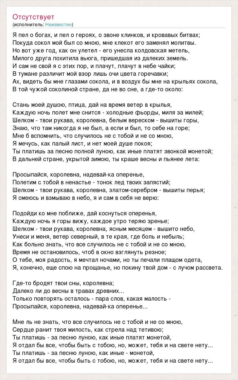 Я пел о богах, и пел о героях, о звоне клинков, и кровавых битвах; Покуда сокол мой был со мною, мне клекот его заменял молитвы. Но вот уже год, как он улетел - его унесла колдовская метель, Милого друга похитила вьюга, пришедшая из далеких земель. И сам не свой я с этих пор, и плачут, плачут в небе чайки; В тумане различит мой взор лишь очи цвета горечавки; Ах, видеть бы мне глазами сокола, и в воздух бы мне на крыльях сокола, В той чужой соколиной стране, да не во сне, а где-то около: Стань моей душою, птица, дай на время ветер в крылья, Каждую ночь полет мне снится - холодные фьорды, миля за милей; Шелком - твои рукава, королевна, белым вереском - вышиты горы, Знаю, что там никогда я не был, а если и был, то себе на горе; Мне б вспомнить, что случилось не с тобой и не со мною, Я мечусь, как палый лист, и нет моей душе покоя; Ты платишь за песню полной луною, как иные платят звонкой монетой; В дальней стране, укрытой зимою, ты краше весны и пьянее лета: Просыпайся, королевна, надевай-ка оперенье, Полетим с тобой в ненастье - тонок лед твоих запястий; Шелком - твои рукава, королевна, златом-серебром - вышиты перья; Я смеюсь и взмываю в небо, я и сам в себя не верю: Подойди ко мне поближе, дай коснуться оперенья, Каждую ночь я горы вижу, каждое утро теряю зренье; Шелком - твои рукава, королевна, ясным месяцем - вышито небо, Унеси и меня, ветер северный, в те края, где боль и небыль; Как больно знать, что все случилось не с тобой и не со мною, Время не остановилось, чтоб в окно взглянуть резное; О тебе, моя радость, я мечтал ночами, но ты печали плащом одета, Я, конечно, еще спою на прощанье, но покину твой дом - с лучом рассвета. Где-то бродят твои сны, королевна; Далеко ли до весны в травах древних... Только повторять осталось - пара слов, какая малость - Просыпайся, королевна, надевай-ка оперенье... Мне ль не знать, что все случилось не с тобой и не со мною, Сердце ранит твоя милость, как стрела над тетивою; Ты платишь - за песню луною, как иные платят монетой, Я отдал бы все, чтобы быть с тобою, но, может, тебя и на свете нету... Ты платишь - за песню луною, как иные - монетой, Я отдал бы все, чтобы быть с тобою, но, может, тебя и на свете нету...
