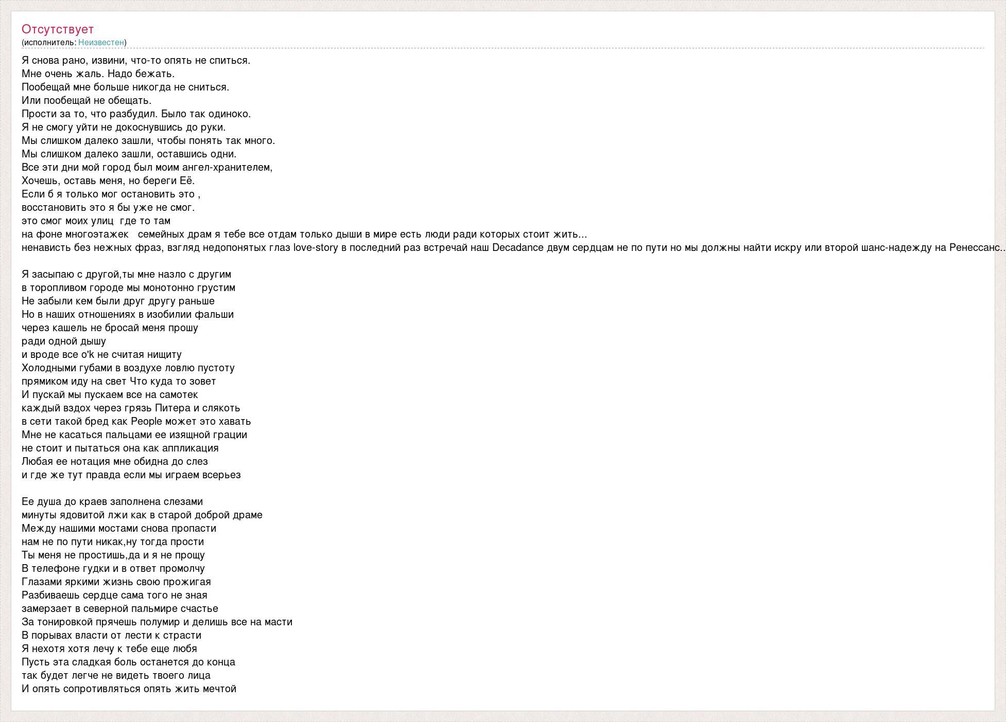 Я снова рано, извини, что-то опять не спиться. Мне очень жаль. Надо бежать. Пообещай мне больше никогда не сниться. Или пообещай не обещать. Прости за то, что разбудил. Было так одиноко. Я не смогу уйти не докоснувшись до руки. Мы слишком далеко зашли, чтобы понять так много. Мы слишком далеко зашли, оставшись одни. Все эти дни мой город был моим ангел-хранителем, Хочешь, оставь меня, но береги Её. Если б я только мог остановить это , восстановить это я бы уже не смог. это смог моих улиц где то там на фоне многоэтажек семейных драм я тебе все отдам только дыши в мире есть люди ради которых стоит жить... ненависть без нежных фраз, взгляд недопонятых глаз love-story в последний раз встречай наш Decadance двум сердцам не по пути но мы должны найти искру или второй шанс-надежду на Ренессанс.. Я засыпаю с другой,ты мне назло с другим в торопливом городе мы монотонно грустим Не забыли кем были друг другу раньше Но в наших отношениях в изобилии фальши через кашель не бросай меня прошу ради одной дышу и вроде все о'k не считая нищиту Холодными губами в воздухе ловлю пустоту прямиком иду на свет Что куда то зовет И пускай мы пускаем все на самотек каждый вздох через грязь Питера и слякоть в сети такой бред как People может это хавать Мне не касаться пальцами ее изящной грации не стоит и пытаться она как аппликация Любая ее нотация мне обидна до слез и где же тут правда если мы играем всерьез Ее душа до краев заполнена слезами минуты ядовитой лжи как в старой доброй драме Между нашими мостами снова пропасти нам не по пути никак,ну тогда прости Ты меня не простишь,да и я не прощу В телефоне гудки и в ответ промолчу Глазами яркими жизнь свою прожигая Разбиваешь сердце сама того не зная замерзает в северной пальмире счастье За тонировкой прячешь полумир и делишь все на масти В порывах власти от лести к страсти Я нехотя хотя лечу к тебе еще любя Пусть эта сладкая боль останется до конца так будет легче не видеть твоего лица И опять сопротивляться опять жить мечтой