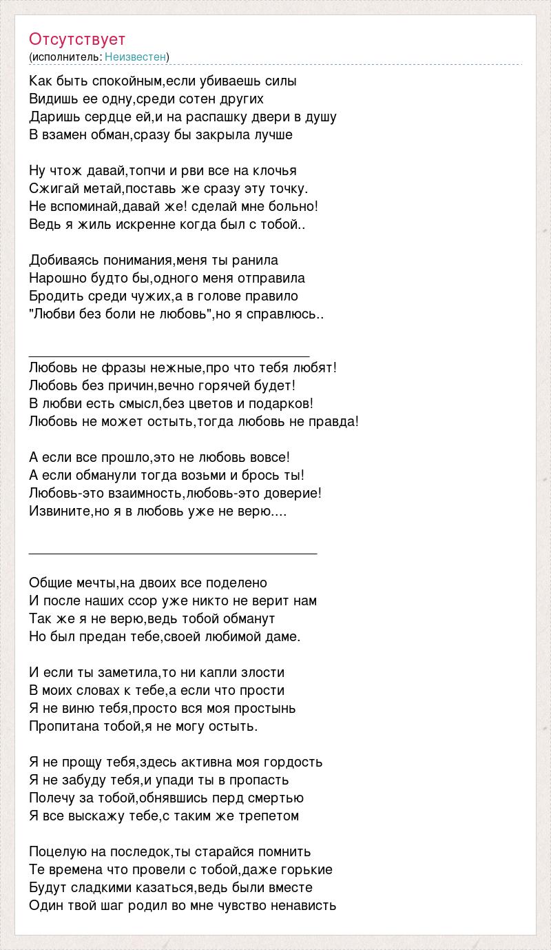 Как быть спокойным,если убиваешь силы Видишь ее одну,среди сотен других Даришь сердце ей,и на распашку двери в душу В взамен обман,сразу бы закрыла лучше Ну чтож давай,топчи и рви все на клочья Сжигай метай,поставь же сразу эту точку. Не вспоминай,давай же! сделай мне больно! Ведь я жиль искренне когда был с тобой.. Добиваясь понимания,меня ты ранила Нарошно будто бы,одного меня отправила Бродить среди чужих,а в голове правило "Любви без боли не любовь",но я справлюсь.. _____________________________________ Любовь не фразы нежные,про что тебя любят! Любовь без причин,вечно горячей будет! В любви есть смысл,без цветов и подарков! Любовь не может остыть,тогда любовь не правда! А если все прошло,это не любовь вовсе! А если обманули тогда возьми и брось ты! Любовь-это взаимность,любовь-это доверие! Извините,но я в любовь уже не верю.... ______________________________________ Общие мечты,на двоих все поделено И после наших ссор уже никто не верит нам Так же я не верю,ведь тобой обманут Но был предан тебе,своей любимой даме. И если ты заметила,то ни капли злости В моих словах к тебе,а если что прости Я не виню тебя,просто вся моя простынь Пропитана тобой,я не могу остыть. Я не прощу тебя,здесь активна моя гордость Я не забуду тебя,и упади ты в пропасть Полечу за тобой,обнявшись перд смертью Я все выскажу тебе,с таким же трепетом Поцелую на последок,ты старайся помнить Те времена что провели с тобой,даже горькие Будут сладкими казаться,ведь были вместе Один твой шаг родил во мне чувство ненависть