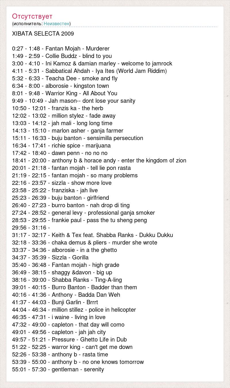 XIBATA SELECTA 2009 0:27 - 1:48 - Fantan Mojah - Murderer 1:49 - 2:59 - Collie Buddz - blind to you 3:00 - 4:10 - Ini Kamoz & damian marley - welcome to jamrock 4:11 - 5:31 - Sabbatical Ahdah - Iya Ites (World Jam Riddim) 5:32 - 6:33 - Teacha Dee - smoke and fly 6:34 - 8:00 - alborosie - kingston town 8:01 - 9:48 - Warrior King - All About You 9:49 - 10:49 - Jah mason-- dont lose your sanity 10:50 - 12:01 - franzis ka - the herb 12:02 - 13:02 - million stylez - fade away 13:03 - 14:12 - jah mali - long long time 14:13 - 15:10 - marlon asher - ganja farmer 15:11 - 16:33 - buju banton - sensimilla persecution 16:34 - 17:41 - richie spice - marijuana 17:42 - 18:40 - dawn penn - no no no 18:41 - 20:00 - anthony b & horace andy - enter the kingdom of zion 20:01 - 21:18 - fantan mojah - tell lie pon rasta 21:19 - 22:15 - fantan mojah - so many problems 22:16 - 23:57 - sizzla - show more love 23:58 - 25:22 - franziska - jah live 25:23 - 26:39 - buju banton - girlfriend 26:40 - 27:23 - burro banton - nah drop di ting 27:24 - 28:52 - general levy - professional ganja smoker 28:53 - 29:55 - frankie paul - pass the tu sheng peng 29:56 - 31:16 - 31:17 - 32:17 - Keith & Tex feat. Shabba Ranks - Dukku Dukku 32:18 - 33:36 - chaka demus & pliers - murder she wrote 33:37 - 34:36 - alborosie - in a the ghetto 34:37 - 35:39 - Sizzla - Gorilla 35:40 - 36:48 - Fantan mojah - high grade 36:49 - 38:15 - shaggy &davon - big up 38:16 - 39:00 - Shabba Ranks - Ting-A-ling 39:01 - 40:15 - Burro Banton - Badder than them 40:16 - 41:36 - Anthony - Badda Dan Weh 41:37 - 44:03 - Bunji Garlin - Brrrt 44:04 - 46:34 - million stillez - police in helicopter 46:35 - 47:31 - i waine - living in love 47:32 - 49:00 - capleton - that day will como 49:01 - 49:56 - capleton - jah jah city 49:57 - 51:21 - Pressure - Ghetto Life in Dub 51:22 - 52:25 - warror king - can't get me down 52:26 - 53:38 - anthony b - rasta time 53:39 - 55:00 - anthony b - no one knows tomorrow 55:01 - 57:30 - gentleman - serenity
