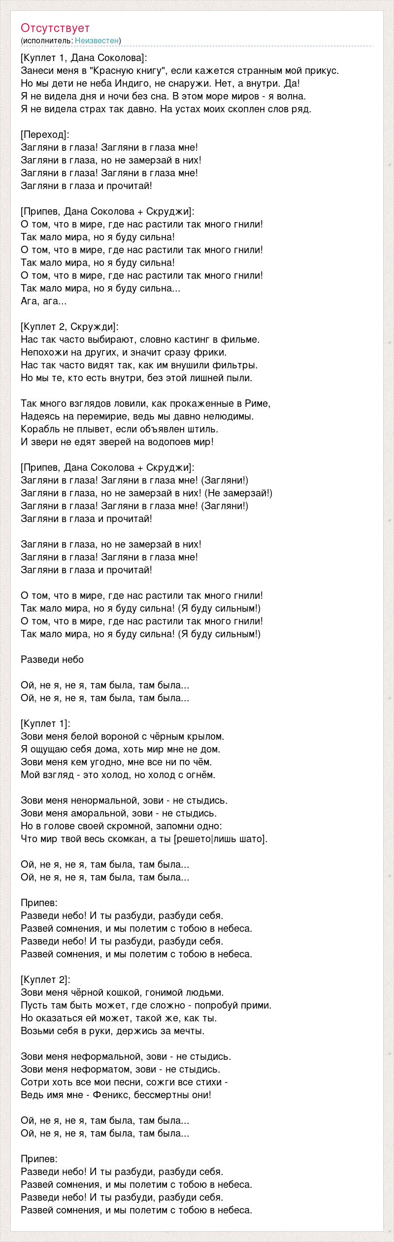 [Куплет 1, Дана Соколова]: Занеси меня в "Красную книгу", если кажется странным мой прикус. Но мы дети не неба Индиго, не снаружи. Нет, а внутри. Да! Я не видела дня и ночи без сна. В этом море миров - я волна. Я не видела страх так давно. На устах моих скоплен слов ряд. [Переход]: Загляни в глаза! Загляни в глаза мне! Загляни в глаза, но не замерзай в них! Загляни в глаза! Загляни в глаза мне! Загляни в глаза и прочитай! [Припев, Дана Соколова + Скруджи]: О том, что в мире, где нас растили так много гнили! Так мало мира, но я буду сильна! О том, что в мире, где нас растили так много гнили! Так мало мира, но я буду сильна! О том, что в мире, где нас растили так много гнили! Так мало мира, но я буду сильна... Ага, ага... [Куплет 2, Скружди]: Нас так часто выбирают, словно кастинг в фильме. Непохожи на других, и значит сразу фрики. Нас так часто видят так, как им внушили фильтры. Но мы те, кто есть внутри, без этой лишней пыли. Так много взглядов ловили, как прокаженные в Риме, Надеясь на перемирие, ведь мы давно нелюдимы. Корабль не плывет, если объявлен штиль. И звери не едят зверей на водопоев мир! [Припев, Дана Соколова + Скруджи]: Загляни в глаза! Загляни в глаза мне! (Загляни!) Загляни в глаза, но не замерзай в них! (Не замерзай!) Загляни в глаза! Загляни в глаза мне! (Загляни!) Загляни в глаза и прочитай! Загляни в глаза, но не замерзай в них! Загляни в глаза! Загляни в глаза мне! Загляни в глаза и прочитай! О том, что в мире, где нас растили так много гнили! Так мало мира, но я буду сильна! (Я буду сильным!) О том, что в мире, где нас растили так много гнили! Так мало мира, но я буду сильна! (Я буду сильным!) Разведи небо Ой, не я, не я, там была, там была... Ой, не я, не я, там была, там была... [Куплет 1]: Зови меня белой вороной с чёрным крылом. Я ощущаю себя дома, хоть мир мне не дом. Зови меня кем угодно, мне все ни по чём. Мой взгляд - это холод, но холод с огнём. Зови меня ненормальной, зови - не стыдись. Зови меня аморальной, зови - не стыдись. Но в голове своей скромной, запомни одно: Что мир твой весь скомкан, а ты [решето|лишь шато]. Ой, не я, не я, там была, там была... Ой, не я, не я, там была, там была... Припев: Разведи небо! И ты разбуди, разбуди себя. Развей сомнения, и мы полетим с тобою в небеса. Разведи небо! И ты разбуди, разбуди себя. Развей сомнения, и мы полетим с тобою в небеса. [Куплет 2]: Зови меня чёрной кошкой, гонимой людьми. Пусть там быть может, где сложно - попробуй прими. Но оказаться ей может, такой же, как ты. Возьми себя в руки, держись за мечты. Зови меня неформальной, зови - не стыдись. Зови меня неформатом, зови - не стыдись. Сотри хоть все мои песни, сожги все стихи - Ведь имя мне - Феникс, бессмертны они! Ой, не я, не я, там была, там была... Ой, не я, не я, там была, там была... Припев: Разведи небо! И ты разбуди, разбуди себя. Развей сомнения, и мы полетим с тобою в небеса. Разведи небо! И ты разбуди, разбуди себя. Развей сомнения, и мы полетим с тобою в небеса.