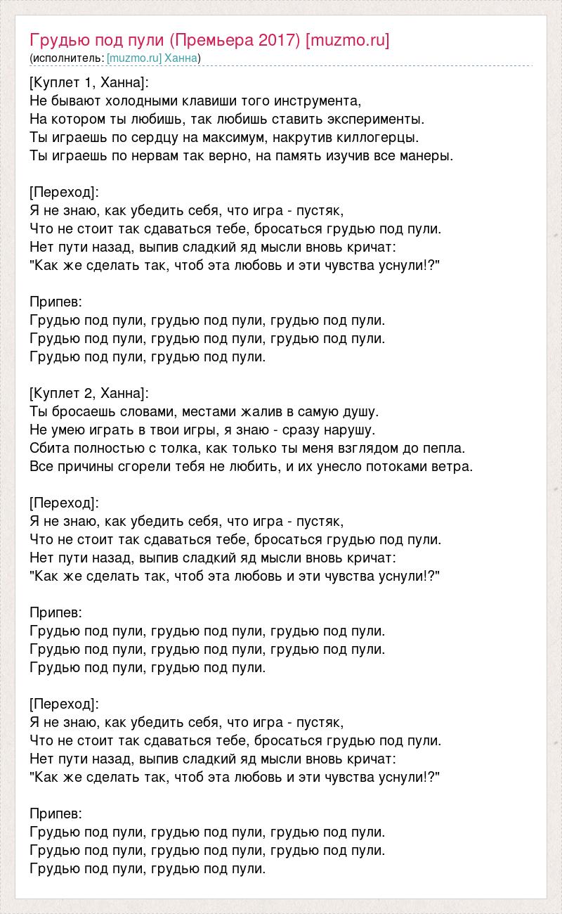 [Куплет 1, Ханна]: Не бывают холодными клавиши того инструмента, На котором ты любишь, так любишь ставить эксперименты. Ты играешь по сердцу на максимум, накрутив киллогерцы. Ты играешь по нервам так верно, на память изучив все манеры. [Переход]: Я не знаю, как убедить себя, что игра - пустяк, Что не стоит так сдаваться тебе, бросаться грудью под пули. Нет пути назад, выпив сладкий яд мысли вновь кричат: "Как же сделать так, чтоб эта любовь и эти чувства уснули!?" Припев: Грудью под пули, грудью под пули, грудью под пули. Грудью под пули, грудью под пули, грудью под пули. Грудью под пули, грудью под пули. [Куплет 2, Ханна]: Ты бросаешь словами, местами жалив в самую душу. Не умею играть в твои игры, я знаю - сразу нарушу. Сбита полностью с толка, как только ты меня взглядом до пепла. Все причины сгорели тебя не любить, и их унесло потоками ветра. [Переход]: Я не знаю, как убедить себя, что игра - пустяк, Что не стоит так сдаваться тебе, бросаться грудью под пули. Нет пути назад, выпив сладкий яд мысли вновь кричат: "Как же сделать так, чтоб эта любовь и эти чувства уснули!?" Припев: Грудью под пули, грудью под пули, грудью под пули. Грудью под пули, грудью под пули, грудью под пули. Грудью под пули, грудью под пули. [Переход]: Я не знаю, как убедить себя, что игра - пустяк, Что не стоит так сдаваться тебе, бросаться грудью под пули. Нет пути назад, выпив сладкий яд мысли вновь кричат: "Как же сделать так, чтоб эта любовь и эти чувства уснули!?" Припев: Грудью под пули, грудью под пули, грудью под пули. Грудью под пули, грудью под пули, грудью под пули. Грудью под пули, грудью под пули.