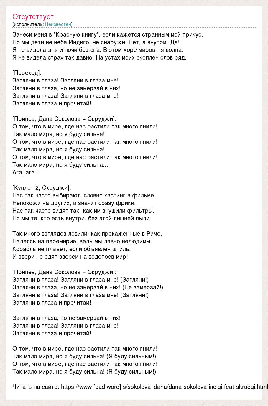 Занеси меня в "Красную книгу", если кажется странным мой прикус. Но мы дети не неба Индиго, не снаружи. Нет, а внутри. Да! Я не видела дня и ночи без сна. В этом море миров - я волна. Я не видела страх так давно. На устах моих скоплен слов ряд. [Переход]: Загляни в глаза! Загляни в глаза мне! Загляни в глаза, но не замерзай в них! Загляни в глаза! Загляни в глаза мне! Загляни в глаза и прочитай! [Припев, Дана Соколова + Скруджи]: О том, что в мире, где нас растили так много гнили! Так мало мира, но я буду сильна! О том, что в мире, где нас растили так много гнили! Так мало мира, но я буду сильна! О том, что в мире, где нас растили так много гнили! Так мало мира, но я буду сильна... Ага, ага... [Куплет 2, Скруджи]: Нас так часто выбирают, словно кастинг в фильме. Непохожи на других, и значит сразу фрики. Нас так часто видят так, как им внушили фильтры. Но мы те, кто есть внутри, без этой лишней пыли. Так много взглядов ловили, как прокаженные в Риме, Надеясь на перемирие, ведь мы давно нелюдимы. Корабль не плывет, если объявлен штиль. И звери не едят зверей на водопоев мир! [Припев, Дана Соколова + Скруджи]: Загляни в глаза! Загляни в глаза мне! (Загляни!) Загляни в глаза, но не замерзай в них! (Не замерзай!) Загляни в глаза! Загляни в глаза мне! (Загляни!) Загляни в глаза и прочитай! Загляни в глаза, но не замерзай в них! Загляни в глаза! Загляни в глаза мне! Загляни в глаза и прочитай! О том, что в мире, где нас растили так много гнили! Так мало мира, но я буду сильна! (Я буду сильным!) О том, что в мире, где нас растили так много гнили! Так мало мира, но я буду сильна! (Я буду сильным!) Читать на сайте: https://www [bad word] s/sokolova_dana/dana-sokolova-indigi-feat-skrudgi.html