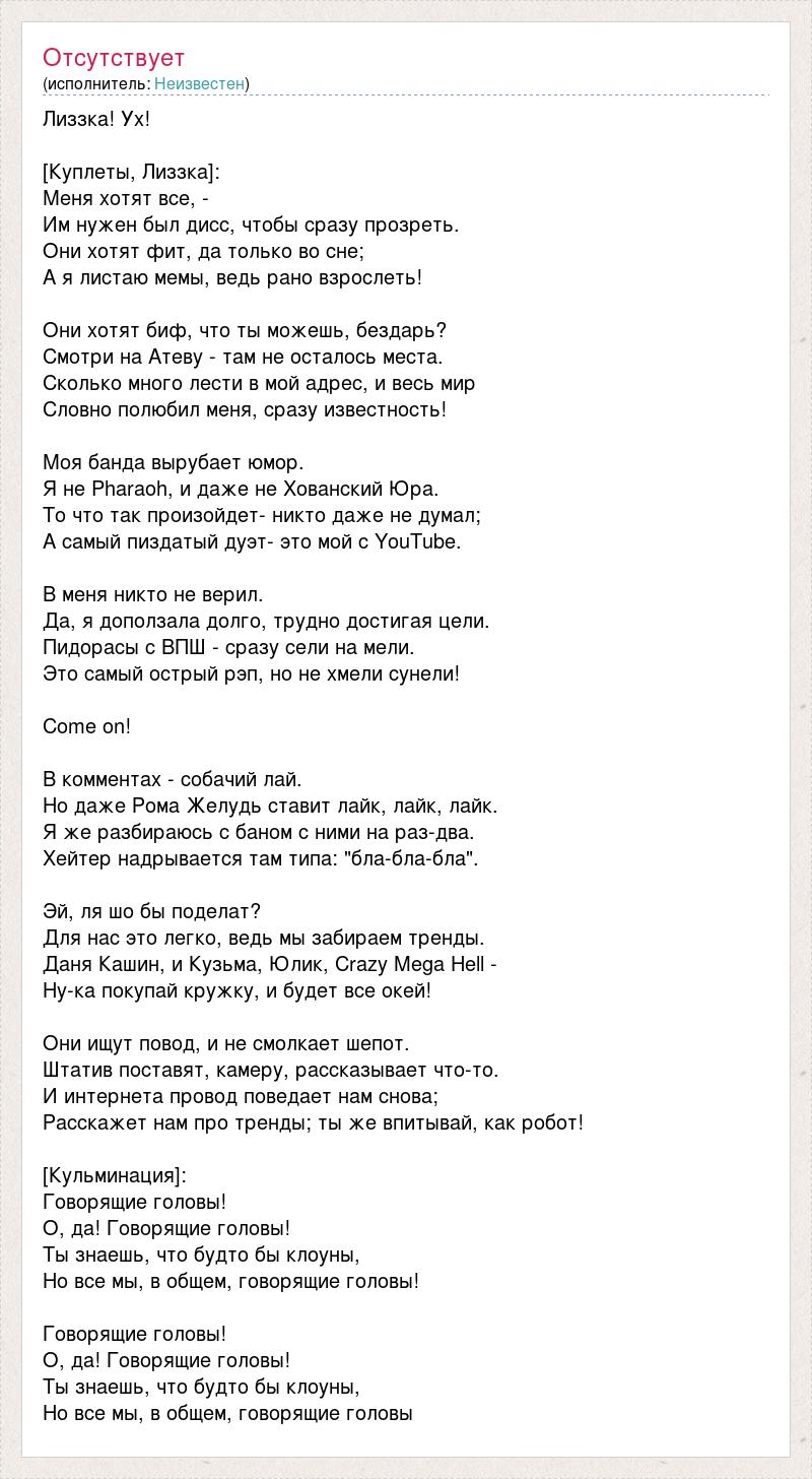 Лиззка! Ух! [Куплеты, Лиззка]: Меня хотят все, - Им нужен был дисс, чтобы сразу прозреть. Они хотят фит, да только во сне; А я листаю мемы, ведь рано взрослеть! Они хотят биф, что ты можешь, бездарь? Смотри на Атеву - там не осталось места. Сколько много лести в мой адрес, и весь мир Словно полюбил меня, сразу известность! Моя банда вырубает юмор. Я не Pharaoh, и даже не Хованский Юра. То что так произойдет- никто даже не думал; А самый пиздатый дуэт- это мой с YouTube. В меня никто не верил. Да, я доползала долго, трудно достигая цели. Пидорасы с ВПШ - сразу сели на мели. Это самый острый рэп, но не хмели сунели! Come on! В комментах - собачий лай. Но даже Рома Желудь ставит лайк, лайк, лайк. Я же разбираюсь с баном с ними на раз-два. Хейтер надрывается там типа: "бла-бла-бла". Эй, ля шо бы поделат? Для нас это легко, ведь мы забираем тренды. Даня Кашин, и Кузьма, Юлик, Crazy Mega Hell - Ну-ка покупай кружку, и будет все окей! Они ищут повод, и не смолкает шепот. Штатив поставят, камеру, рассказывает что-то. И интернета провод поведает нам снова; Расскажет нам про тренды; ты же впитывай, как робот! [Кульминация]: Говорящие головы! О, да! Говорящие головы! Ты знаешь, что будто бы клоуны, Но все мы, в общем, говорящие головы! Говорящие головы! О, да! Говорящие головы! Ты знаешь, что будто бы клоуны, Но все мы, в общем, говорящие головы