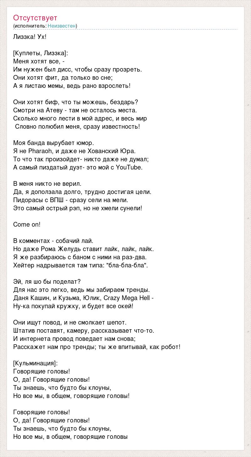 Лиззка! Ух! [Куплеты, Лиззка]: Меня хотят все, - Им нужен был дисс, чтобы сразу прозреть. Они хотят фит, да только во сне; А я листаю мемы, ведь рано взрослеть! Они хотят биф, что ты можешь, бездарь? Смотри на Атеву - там не осталось места. Сколько много лести в мой адрес, и весь мир Словно полюбил меня, сразу известность! Моя банда вырубает юмор. Я не Pharaoh, и даже не Хованский Юра. То что так произойдет- никто даже не думал; А самый пиздатый дуэт- это мой с YouTube. В меня никто не верил. Да, я доползала долго, трудно достигая цели. Пидорасы с ВПШ - сразу сели на мели. Это самый острый рэп, но не хмели сунели! Come on! В комментах - собачий лай. Но даже Рома Желудь ставит лайк, лайк, лайк. Я же разбираюсь с баном с ними на раз-два. Хейтер надрывается там типа: "бла-бла-бла". Эй, ля шо бы поделат? Для нас это легко, ведь мы забираем тренды. Даня Кашин, и Кузьма, Юлик, Crazy Mega Hell - Ну-ка покупай кружку, и будет все окей! Они ищут повод, и не смолкает шепот. Штатив поставят, камеру, рассказывает что-то. И интернета провод поведает нам снова; Расскажет нам про тренды; ты же впитывай, как робот! [Кульминация]: Говорящие головы! О, да! Говорящие головы! Ты знаешь, что будто бы клоуны, Но все мы, в общем, говорящие головы! Говорящие головы! О, да! Говорящие головы! Ты знаешь, что будто бы клоуны, Но все мы, в общем, говорящие головы
