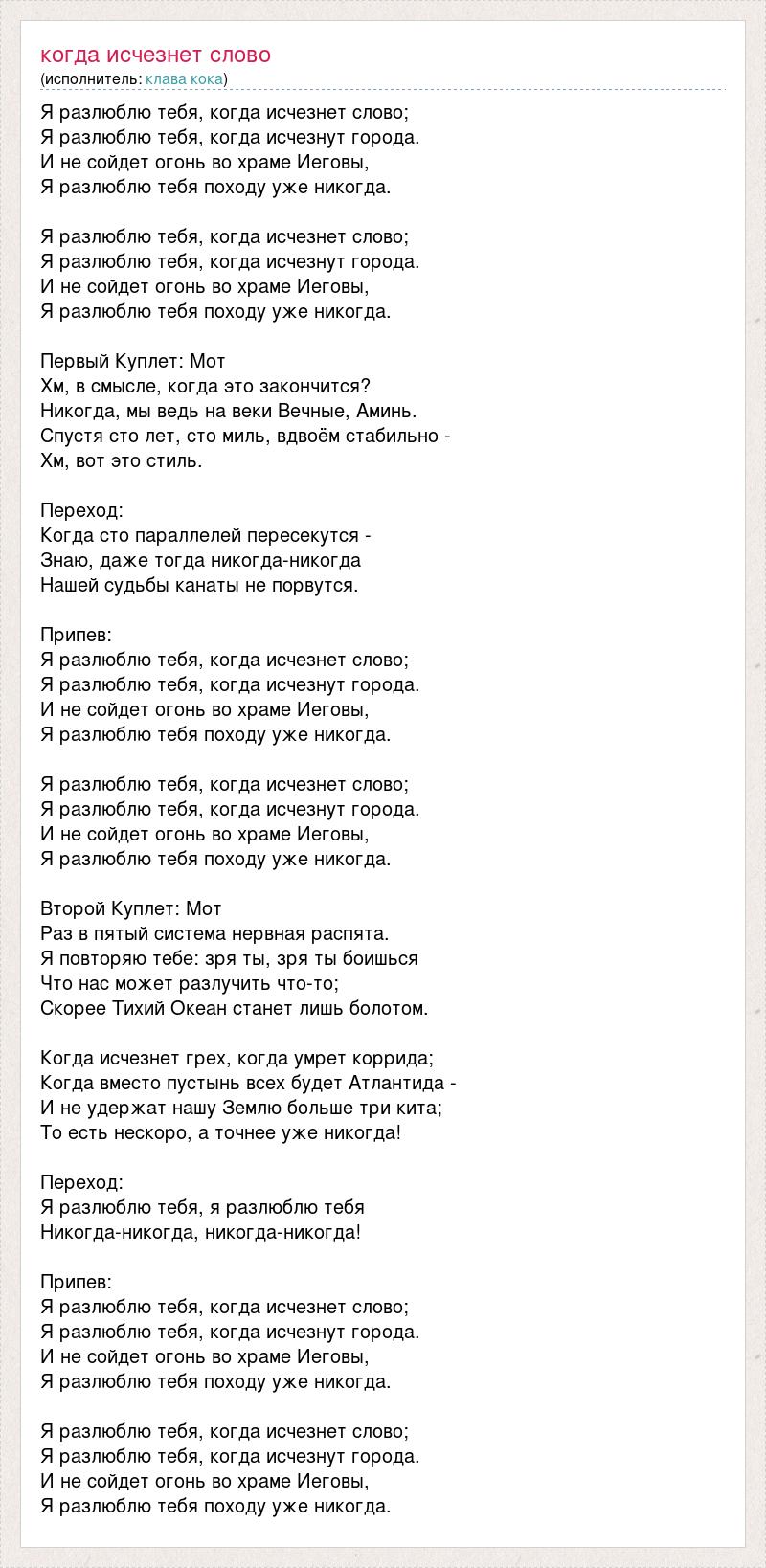 Я разлюблю тебя, когда исчезнет слово; Я разлюблю тебя, когда исчезнут города. И не сойдет огонь во храме Иеговы, Я разлюблю тебя походу уже никогда. Я разлюблю тебя, когда исчезнет слово; Я разлюблю тебя, когда исчезнут города. И не сойдет огонь во храме Иеговы, Я разлюблю тебя походу уже никогда. Первый Куплет: Мот Хм, в смысле, когда это закончится? Никогда, мы ведь на веки Вечные, Аминь. Спустя сто лет, сто миль, вдвоём стабильно - Хм, вот это стиль. Переход: Когда сто параллелей пересекутся - Знаю, даже тогда никогда-никогда Нашей судьбы канаты не порвутся. Припев: Я разлюблю тебя, когда исчезнет слово; Я разлюблю тебя, когда исчезнут города. И не сойдет огонь во храме Иеговы, Я разлюблю тебя походу уже никогда. Я разлюблю тебя, когда исчезнет слово; Я разлюблю тебя, когда исчезнут города. И не сойдет огонь во храме Иеговы, Я разлюблю тебя походу уже никогда. Второй Куплет: Мот Раз в пятый система нервная распята. Я повторяю тебе: зря ты, зря ты боишься Что нас может разлучить что-то; Скорее Тихий Океан станет лишь болотом. Когда исчезнет грех, когда умрет коррида; Когда вместо пустынь всех будет Атлантида - И не удержат нашу Землю больше три кита; То есть нескоро, а точнее уже никогда! Переход: Я разлюблю тебя, я разлюблю тебя Никогда-никогда, никогда-никогда! Припев: Я разлюблю тебя, когда исчезнет слово; Я разлюблю тебя, когда исчезнут города. И не сойдет огонь во храме Иеговы, Я разлюблю тебя походу уже никогда. Я разлюблю тебя, когда исчезнет слово; Я разлюблю тебя, когда исчезнут города. И не сойдет огонь во храме Иеговы, Я разлюблю тебя походу уже никогда.