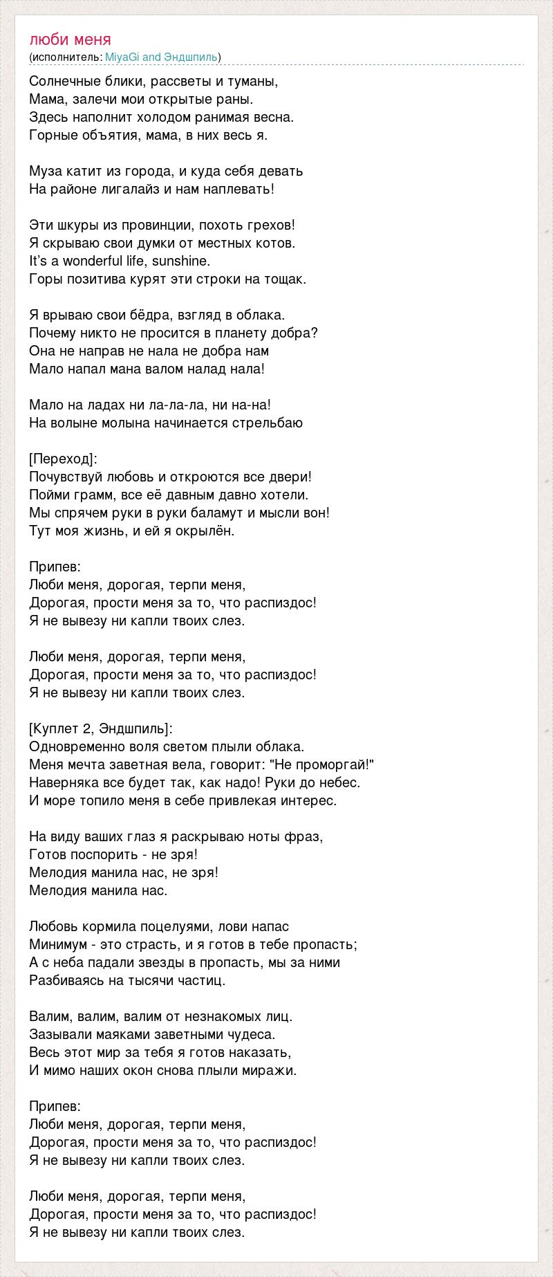 Солнечные блики, рассветы и туманы, Мама, залечи мои открытые раны. Здесь наполнит холодом ранимая весна. Горные объятия, мама, в них весь я. Муза катит из города, и куда себя девать На районе лигалайз и нам наплевать! Эти шкуры из провинции, похоть грехов! Я скрываю свои думки от местных котов. It’s a wonderful life, sunshine. Горы позитива курят эти строки на тощак. Я врываю свои бёдра, взгляд в облака. Почему никто не просится в планету добра? Она не направ не нала не добра нам Мало напал мана валом налад нала! Мало на ладах ни ла-ла-ла, ни на-на! На волыне молына начинается стрельбаю [Переход]: Почувствуй любовь и откроются все двери! Пойми грамм, все её давным давно хотели. Мы спрячем руки в руки баламут и мысли вон! Тут моя жизнь, и ей я окрылён. Припев: Люби меня, дорогая, терпи меня, Дорогая, прости меня за то, что распиздос! Я не вывезу ни капли твоих слез. Люби меня, дорогая, терпи меня, Дорогая, прости меня за то, что распиздос! Я не вывезу ни капли твоих слез. [Куплет 2, Эндшпиль]: Одновременно воля светом плыли облака. Меня мечта заветная вела, говорит: "Не проморгай!" Наверняка все будет так, как надо! Руки до небес. И море топило меня в себе привлекая интерес. На виду ваших глаз я раскрываю ноты фраз, Готов поспорить - не зря! Мелодия манила нас, не зря! Мелодия манила нас. Любовь кормила поцелуями, лови напас Минимум - это страсть, и я готов в тебе пропасть; А с неба падали звезды в пропасть, мы за ними Разбиваясь на тысячи частиц. Валим, валим, валим от незнакомых лиц. Зазывали маяками заветными чудеса. Весь этот мир за тебя я готов наказать, И мимо наших окон снова плыли миражи. Припев: Люби меня, дорогая, терпи меня, Дорогая, прости меня за то, что распиздос! Я не вывезу ни капли твоих слез. Люби меня, дорогая, терпи меня, Дорогая, прости меня за то, что распиздос! Я не вывезу ни капли твоих слез.