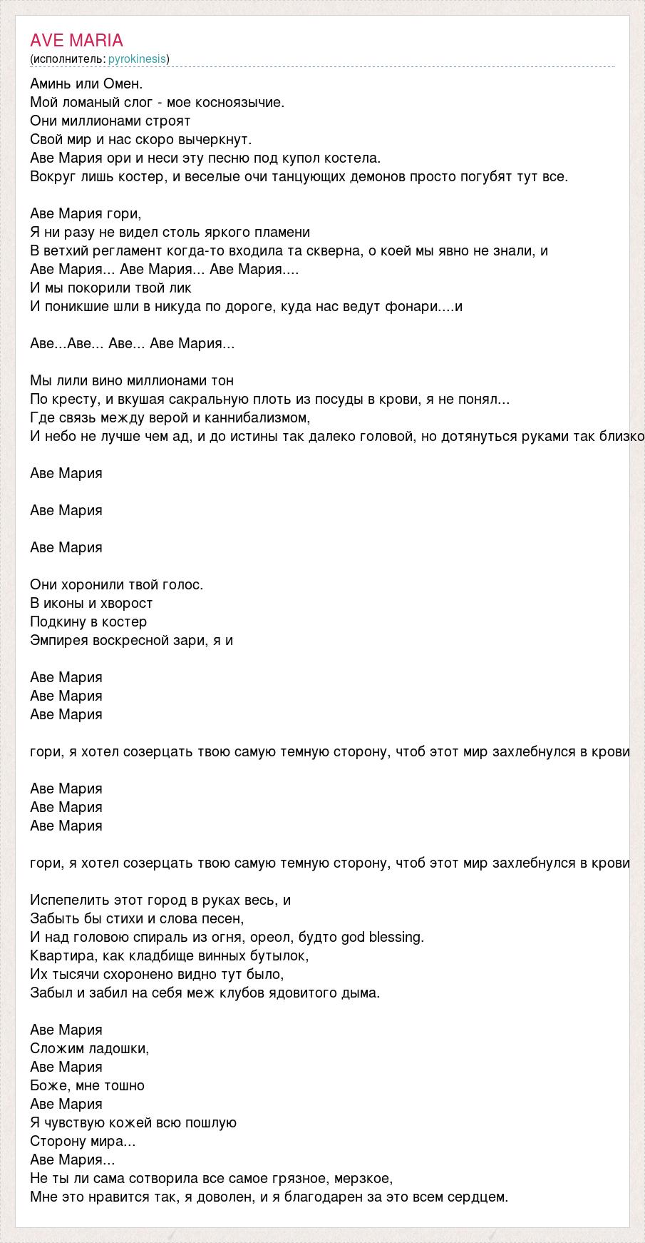 Аминь или Омен. Мой ломаный слог - мое косноязычие. Они миллионами строят Свой мир и нас скоро вычеркнут. Аве Мария ори и неси эту песню под купол костела. Вокруг лишь костер, и веселые очи танцующих демонов просто погубят тут все. Аве Мария гори, Я ни разу не видел столь яркого пламени В ветхий регламент когда-то входила та скверна, о коей мы явно не знали, и Аве Мария... Аве Мария... Аве Мария.... И мы покорили твой лик И поникшие шли в никуда по дороге, куда нас ведут фонари....и Аве...Аве... Аве... Аве Мария... Мы лили вино миллионами тон По кресту, и вкушая сакральную плоть из посуды в крови, я не понял... Где связь между верой и каннибализмом, И небо не лучше чем ад, и до истины так далеко головой, но дотянуться руками так близко Аве Мария Аве Мария Аве Мария Они хоронили твой голос. В иконы и хворост Подкину в костер Эмпирея воскресной зари, я и Аве Мария Аве Мария Аве Мария гори, я хотел созерцать твою самую темную сторону, чтоб этот мир захлебнулся в крови Аве Мария Аве Мария Аве Мария гори, я хотел созерцать твою самую темную сторону, чтоб этот мир захлебнулся в крови Испепелить этот город в руках весь, и Забыть бы стихи и слова песен, И над головою спираль из огня, ореол, будто god blessing. Квартира, как кладбище винных бутылок, Их тысячи схоронено видно тут было, Забыл и забил на себя меж клубов ядовитого дыма. Аве Мария Сложим ладошки, Аве Мария Боже, мне тошно Аве Мария Я чувствую кожей всю пошлую Сторону мира... Аве Мария... Не ты ли сама сотворила все самое грязное, мерзкое, Мне это нравится так, я доволен, и я благодарен за это всем сердцем.