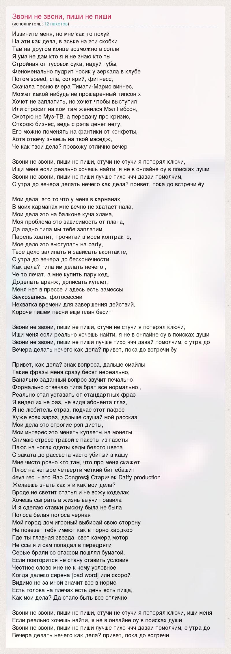 Извините меня, но мне как то похуй На эти как дела, в аське на эти скобки Там на другом конце возможно в сопли Я ума не дам кто я и не знаю кто ты Стройная от тусовок сука, надуй губы, Феноменально пудрит носик у зеркала в клубе Потом speed, спа, солярий, фитнесс, Скачала песню вчера Тимати-Марио виннес, Может какой нибудь не прошаренный типсон х Хочет не заплатить, но хочет чтобы выступил Или спросит на ком там женился Мэл Гибсон, Смотрю не Муз-ТВ, а передачу про кризис, Открою бизнес, ведь с рэпа денег нету, Его можно поменять на фантики от конфеты, Хотя отвечу знаешь на твой мэседж, Че как твои дела? провожу отлично вечер Звони не звони, пиши не пиши, стучи не стучи я потерял ключи, Ищи меня если реально хочешь найти, я не в онлайне оу в поисках души Звони не звони, пиши не пиши лучше тихо ччч давай помолчим, С утра до вечера делать нечего как дела? привет, пока до встречи ёу Мои дела, это то что у меня в карманах, В моих карманах мне вечно не хватает нала, Мои дела это на балконе куча хлама, Моя проблема это зависимость от плана, Да ладно типа мы тебе заплатим, Парень хватит, прочитай в моем контракте, Мое дело это выступать на party, Твое дело залипать и зависать вконтакте, С утра до вечера до бесконечности Как дела? типа им делать нечего , Че то лечат, а мне купить пару кед, Доделать аранж, дописать куплет, Меня нет в прессе и здесь есть замессы Звукозапись, фотосессии Нехватка времени для завершения действий, Короче пишем песни еще план бесит Звони не звони, пиши не пиши, стучи не стучи я потерял ключи, Ищи меня если реально хочешь найти, я не в онлайне оу в поисках души Звони не звони, пиши не пиши лучше тихо ччч давай помолчим, с утра до Вечера делать нечего как дела? привет, пока до встречи ёу Привет, как дела? знак вопроса, дальше смайлы Такие фразы меня сразу бесят нереально, Банально заданный вопрос звучит печально Формально отвечаю типа брат все нормально , Реально стал уставать от стандартных фраз Я видел их не раз, не видя абонента глаз, Я не любитель страз, подчас этот пафос Хуже всех зараз, дальше слушай мой рассказ Мои дела это строгие рэп диеты, Мои интерес это менять куплеты на монеты Снимаю стресс травой с пакеты из газеты Плюс на ногах одеты кеды белого цвета С заката до рассвета часто убитый в кашу Мне чисто ровно кто там, что про меня скажет Плюс на четыре четверти четкий бит ебашит 4eva rec. - это Rap Congres$ Старичек Daffy production Желаешь знать как я и как мои дела? Вроде не светит статья и не вожу коделак Хочешь сыграть в жизнь выучи правила И я сделаю ставки рискну была не была Полоса белая полоса черная Мой город дом игорный выбирай свою сторону Не повезет тебя имеют как в порно хардкор Где ты главная звезда, свет камера мотор Не ссы я и сам попадал в передряги Серые брали со стафом пошлял бумагой, Если повторится не стану ставить условия Честное слово мне не к чему условное Когда далеко сирена [bad word] или скорой Видимо не за мной значит все в норме Есть голова на плечах есть день есть пища, Как мои дела? Да стало быть все отлично Звони не звони, пиши не пиши, стучи не стучи я потерял ключи, ищи меня Если реально хочешь найти, я не в онлайне оу в поисках души Звони не звони, пиши не пиши лучше тихо ччч давай помолчим, с утра до Вечера делать нечего как дела? привет, пока до встречи