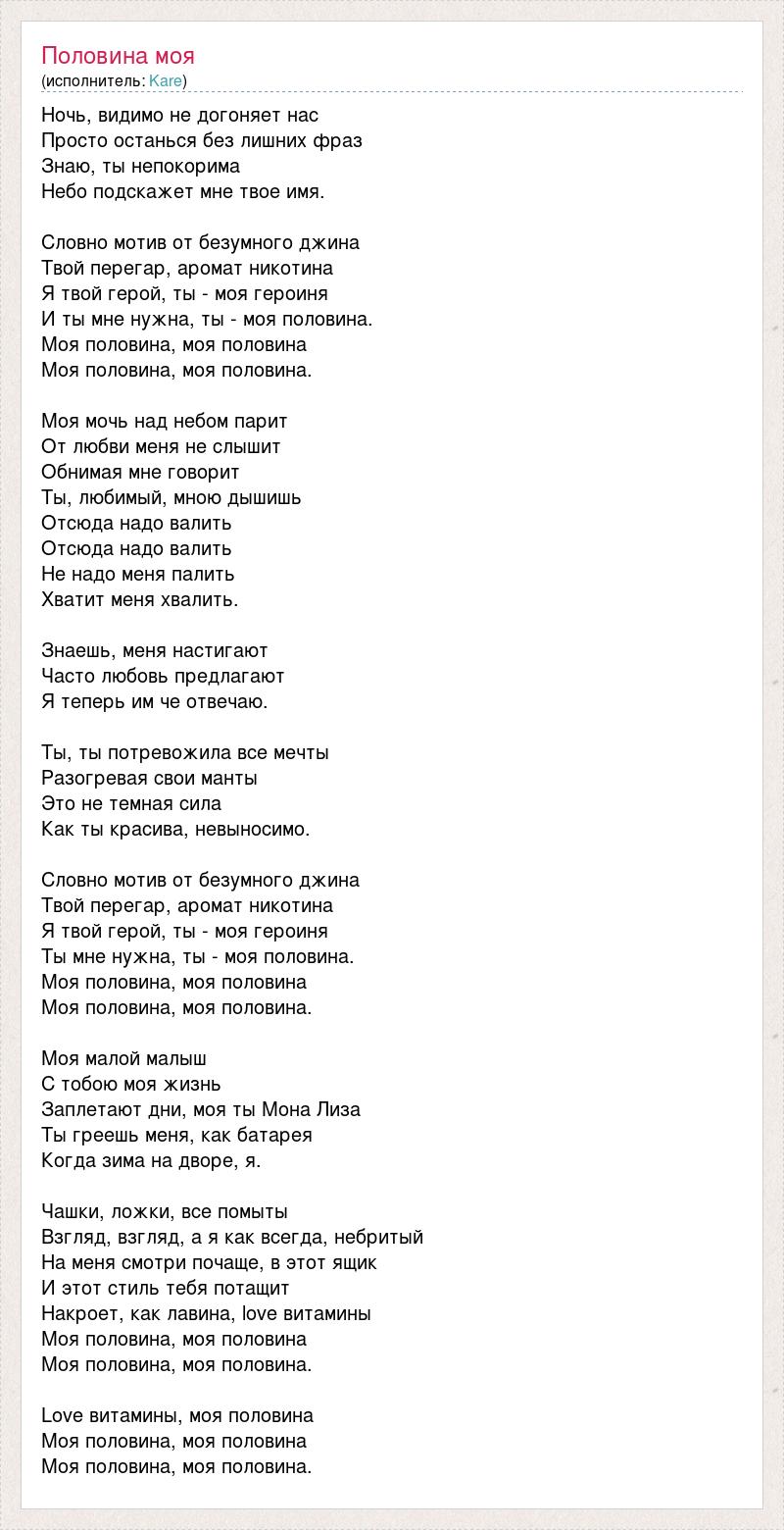 Ночь, видимо не догоняет нас Просто останься без лишних фраз Знаю, ты непокорима Небо подскажет мне твое имя. Словно мотив от безумного джина Твой перегар, аромат никотина Я твой герой, ты - моя героиня И ты мне нужна, ты - моя половина. Моя половина, моя половина Моя половина, моя половина. Моя мочь над небом парит От любви меня не слышит Обнимая мне говорит Ты, любимый, мною дышишь Отсюда надо валить Отсюда надо валить Не надо меня палить Хватит меня хвалить. Знаешь, меня настигают Часто любовь предлагают Я теперь им че отвечаю. Ты, ты потревожила все мечты Разогревая свои манты Это не темная сила Как ты красива, невыносимо. Словно мотив от безумного джина Твой перегар, аромат никотина Я твой герой, ты - моя героиня Ты мне нужна, ты - моя половина. Моя половина, моя половина Моя половина, моя половина. Моя малой малыш С тобою моя жизнь Заплетают дни, моя ты Мона Лиза Ты греешь меня, как батарея Когда зима на дворе, я. Чашки, ложки, все помыты Взгляд, взгляд, а я как всегда, небритый На меня смотри почаще, в этот ящик И этот стиль тебя потащит Накроет, как лавина, love витамины Моя половина, моя половина Моя половина, моя половина. Love витамины, моя половина Моя половина, моя половина Моя половина, моя половина.