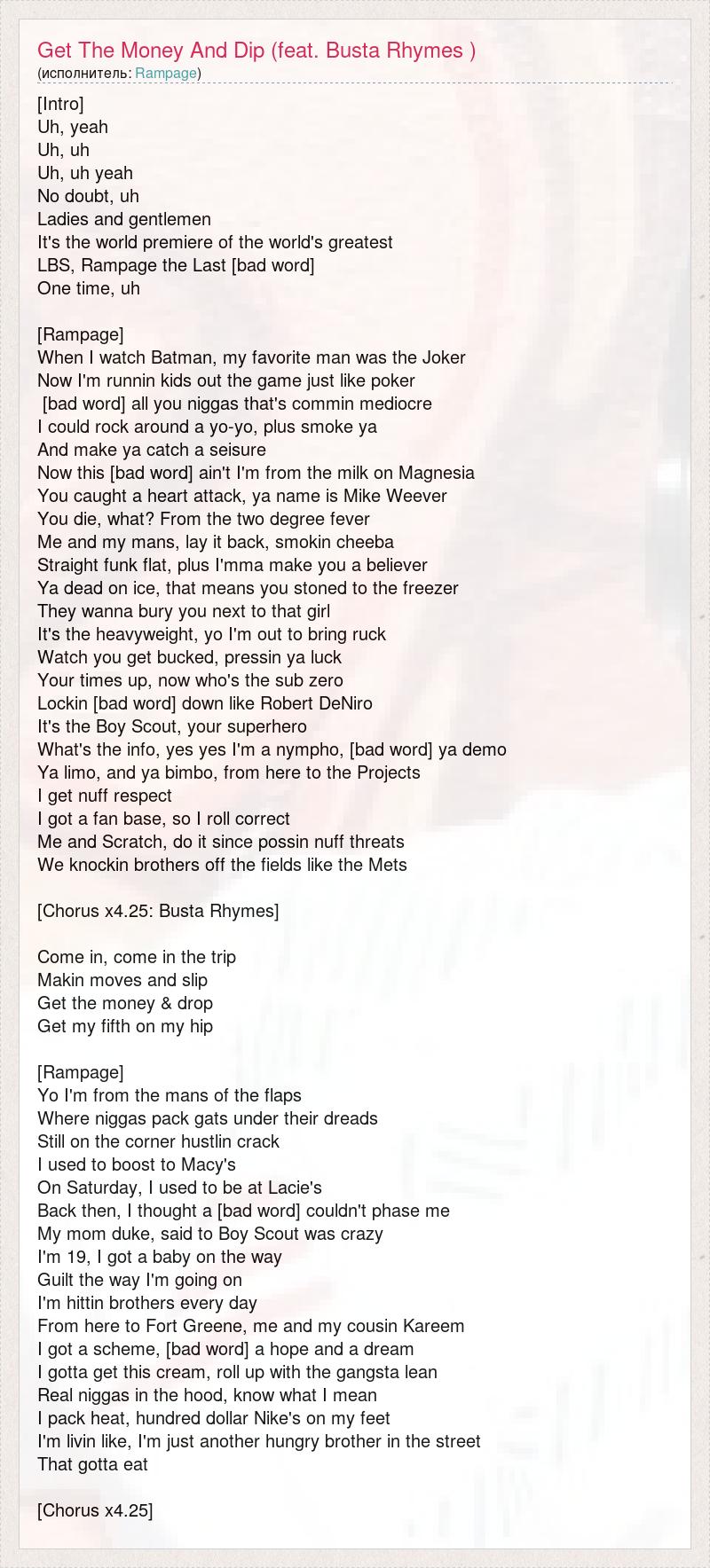 [Intro] Uh, yeah Uh, uh Uh, uh yeah No doubt, uh Ladies and gentlemen It's the world premiere of the world's greatest LBS, Rampage the Last [bad word] One time, uh [Rampage] When I watch Batman, my favorite man was the Joker Now I'm runnin kids out the game just like poker [bad word] all you niggas that's commin mediocre I could rock around a yo-yo, plus smoke ya And make ya catch a seisure Now this [bad word] ain't I'm from the milk on Magnesia You caught a heart attack, ya name is Mike Weever You die, what? From the two degree fever Me and my mans, lay it back, smokin cheeba Straight funk flat, plus I'mma make you a believer Ya dead on ice, that means you stoned to the freezer They wanna bury you next to that girl It's the heavyweight, yo I'm out to bring ruck Watch you get bucked, pressin ya luck Your times up, now who's the sub zero Lockin [bad word] down like Robert DeNiro It's the Boy Scout, your superhero What's the info, yes yes I'm a nympho, [bad word] ya demo Ya limo, and ya bimbo, from here to the Projects I get nuff respect I got a fan base, so I roll correct Me and Scratch, do it since possin nuff threats We knockin brothers off the fields like the Mets [Chorus x4.25: Busta Rhymes] Come in, come in the trip Makin moves and slip Get the money & drop Get my fifth on my hip [Rampage] Yo I'm from the mans of the flaps Where niggas pack gats under their dreads Still on the corner hustlin crack I used to boost to Macy's On Saturday, I used to be at Lacie's Back then, I thought a [bad word] couldn't phase me My mom duke, said to Boy Scout was crazy I'm 19, I got a baby on the way Guilt the way I'm going on I'm hittin brothers every day From here to Fort Greene, me and my cousin Kareem I got a scheme, [bad word] a hope and a dream I gotta get this cream, roll up with the gangsta lean Real niggas in the hood, know what I mean I pack heat, hundred dollar Nike's on my feet I'm livin like, I'm just another hungry brother in the street That gotta eat [Chorus x4.25]