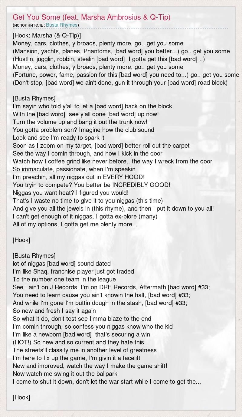 [Hook: Marsha (& Q-Tip)] Money, cars, clothes, y broads, plenty more, go.. get you some (Mansion, yachts, planes, Phantoms, [bad word] you better...) go.. get you some (Hustlin, jugglin, robbin, stealin [bad word] I gotta get this [bad word] ..) Money, cars, clothes, y broads, plenty more, go.. get you some (Fortune, power, fame, passion for this [bad word] you need to...) go.. get you some (Don't stop, [bad word] we ain't done, gun it through your [bad word] road block) [Busta Rhymes] I'm sayin who told y'all to let a [bad word] back on the block With the [bad word] see y'all done [bad word] up now! Turn the volume up and bang it out the trunk now! You gotta problem son? Imagine how the club sound Look and see I'm ready to spark it Soon as I zoom on my target, [bad word] better roll out the carpet See the way I comin through, and how I kick in the door Watch how I coffee grind like never before.. the way I wreck from the door So immaculate, passionate, when I'm speakin I'm preachin, all my niggas out in EVERY HOOD! You tryin to compete? You better be INCREDIBLY GOOD! Niggas you want heat? I figured you would! That's I waste no time to give it to you niggas (this time) And give you all the jewels in (this rhyme), and then I put it down to you all! I can't get enough of it niggas, I gotta ex-plore (many) All of my options, I gotta get me plenty more... [Hook] [Busta Rhymes] lot of niggas [bad word] sound dated I'm like Shaq, franchise player just got traded To the number one team in the league See I ain't on J Records, I'm on DRE Records, Aftermath [bad word] #33; You need to learn cause you ain't knowin the half, [bad word] #33; And while I'm gone I'm puttin dough in the stash, [bad word] #33; So new and fresh I say it again So what it do, don't test see I'mma blaze to the end I'm comin through, so confess you niggas know who the kid I'm like a newborn [bad word] that's securing a win (HOT!) So new and so current and they hate this The streets'll classify me in another level of greatness I'm here to fix up the game, I'm givin it a facelift New and improved, watch the way I make the game shift! Now watch me swing it out the ballpark I come to shut it down, don't let the war start while I come to get the... [Hook]
