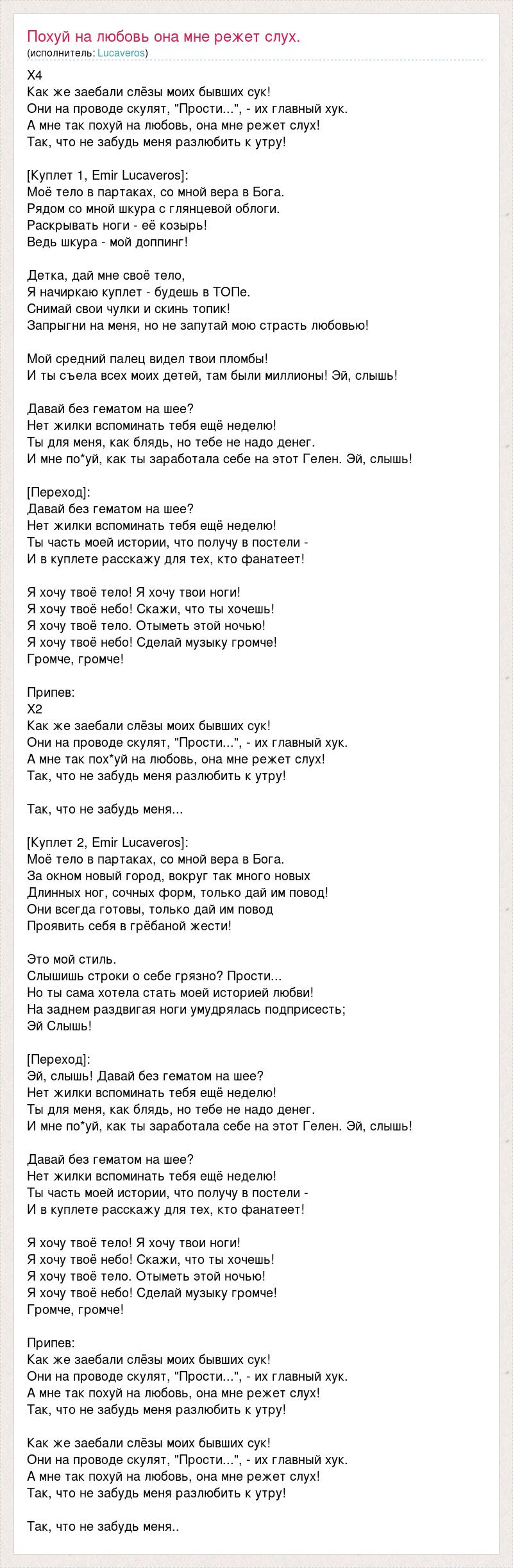 X4 Как же заебали слёзы моих бывших сук! Они на проводе скулят, "Прости...", - их главный хук. А мне так похуй на любовь, она мне режет слух! Так, что не забудь меня разлюбить к утру! [Куплет 1, Emir Lucaveros]: Моё тело в партаках, со мной вера в Бога. Рядом со мной шкура с глянцевой облоги. Раскрывать ноги - её козырь! Ведь шкура - мой доппинг! Детка, дай мне своё тело, Я начиркаю куплет - будешь в ТОПе. Снимай свои чулки и скинь топик! Запрыгни на меня, но не запутай мою страсть любовью! Мой средний палец видел твои пломбы! И ты съела всех моих детей, там были миллионы! Эй, слышь! Давай без гематом на шее? Нет жилки вспоминать тебя ещё неделю! Ты для меня, как блядь, но тебе не надо денег. И мне по*уй, как ты заработала себе на этот Гелен. Эй, слышь! [Переход]: Давай без гематом на шее? Нет жилки вспоминать тебя ещё неделю! Ты часть моей истории, что получу в постели - И в куплете расскажу для тех, кто фанатеет! Я хочу твоё тело! Я хочу твои ноги! Я хочу твоё небо! Скажи, что ты хочешь! Я хочу твоё тело. Отыметь этой ночью! Я хочу твоё небо! Сделай музыку громче! Громче, громче! Припев: X2 Как же заебали слёзы моих бывших сук! Они на проводе скулят, "Прости...", - их главный хук. А мне так пох*уй на любовь, она мне режет слух! Так, что не забудь меня разлюбить к утру! Так, что не забудь меня... [Куплет 2, Emir Lucaveros]: Моё тело в партаках, со мной вера в Бога. За окном новый город, вокруг так много новых Длинных ног, сочных форм, только дай им повод! Они всегда готовы, только дай им повод Проявить себя в грёбаной жести! Это мой стиль. Слышишь строки о себе грязно? Прости... Но ты сама хотела стать моей историей любви! На заднем раздвигая ноги умудрялась подприсесть; Эй Слышь! [Переход]: Эй, слышь! Давай без гематом на шее? Нет жилки вспоминать тебя ещё неделю! Ты для меня, как блядь, но тебе не надо денег. И мне по*уй, как ты заработала себе на этот Гелен. Эй, слышь! Давай без гематом на шее? Нет жилки вспоминать тебя ещё неделю! Ты часть моей истории, что получу в постели - И в куплете расскажу для тех, кто фанатеет! Я хочу твоё тело! Я хочу твои ноги! Я хочу твоё небо! Скажи, что ты хочешь! Я хочу твоё тело. Отыметь этой ночью! Я хочу твоё небо! Сделай музыку громче! Громче, громче! Припев: Как же заебали слёзы моих бывших сук! Они на проводе скулят, "Прости...", - их главный хук. А мне так похуй на любовь, она мне режет слух! Так, что не забудь меня разлюбить к утру! Как же заебали слёзы моих бывших сук! Они на проводе скулят, "Прости...", - их главный хук. А мне так похуй на любовь, она мне режет слух! Так, что не забудь меня разлюбить к утру! Так, что не забудь меня..
