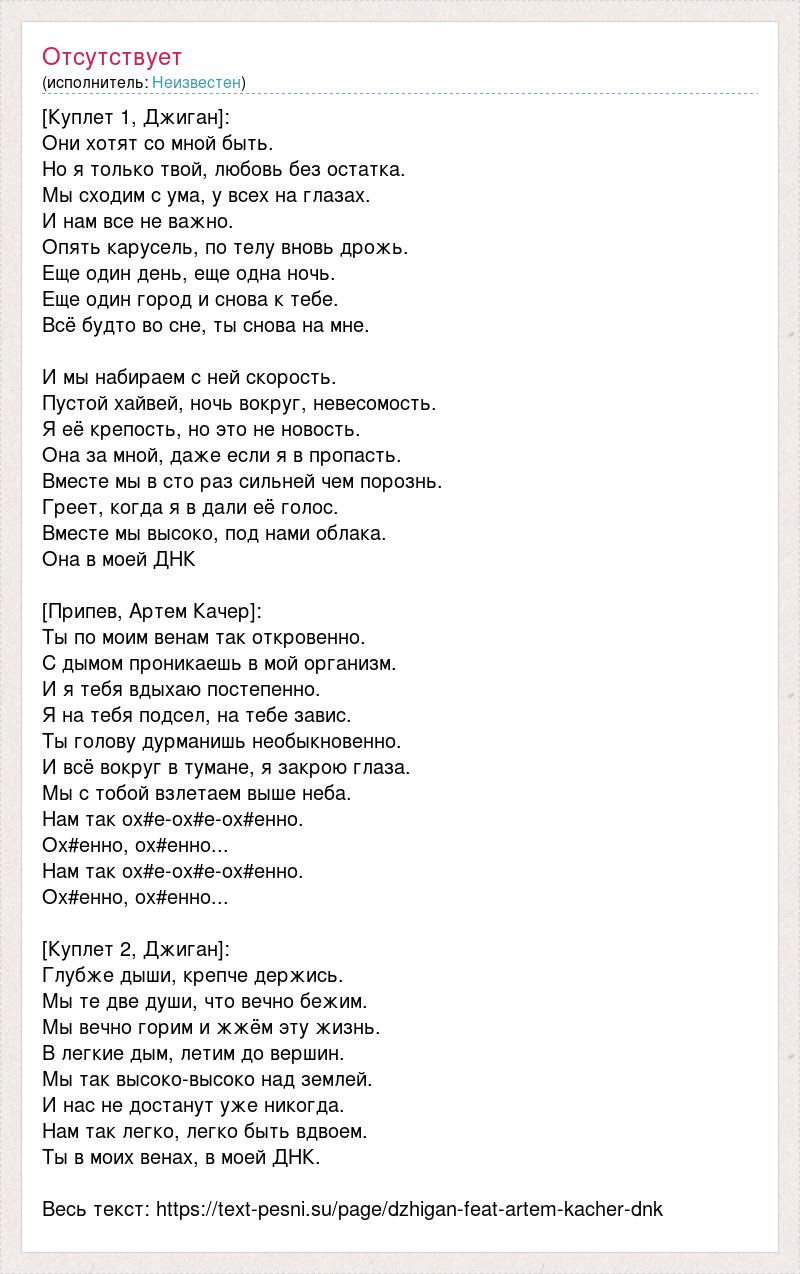 [Куплет 1, Джиган]: Они хотят со мной быть. Но я только твой, любовь без остатка. Мы сходим с ума, у всех на глазах. И нам все не важно. Опять карусель, по телу вновь дрожь. Еще один день, еще одна ночь. Еще один город и снова к тебе. Всё будто во сне, ты снова на мне. И мы набираем с ней скорость. Пустой хайвей, ночь вокруг, невесомость. Я её крепость, но это не новость. Она за мной, даже если я в пропасть. Вместе мы в сто раз сильней чем порознь. Греет, когда я в дали её голос. Вместе мы высоко, под нами облака. Она в моей ДНК [Припев, Артем Качер]: Ты по моим венам так откровенно. С дымом проникаешь в мой организм. И я тебя вдыхаю постепенно. Я на тебя подсел, на тебе завис. Ты голову дурманишь необыкновенно. И всё вокруг в тумане, я закрою глаза. Мы с тобой взлетаем выше неба. Нам так ох#е-ох#е-ох#енно. Ох#енно, ох#енно... Нам так ох#е-ох#е-ох#енно. Ох#енно, ох#енно... [Куплет 2, Джиган]: Глубже дыши, крепче держись. Мы те две души, что вечно бежим. Мы вечно горим и жжём эту жизнь. В легкие дым, летим до вершин. Мы так высоко-высоко над землей. И нас не достанут уже никогда. Нам так легко, легко быть вдвоем. Ты в моих венах, в моей ДНК. Весь текст: https://text-pesni.su/page/dzhigan-feat-artem-kacher-dnk