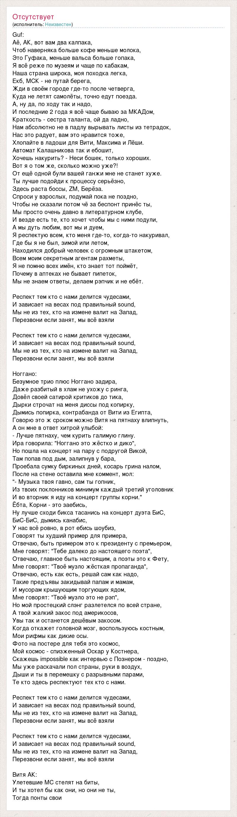 Guf: Аё, АК, вот вам два калпака, Чтоб наверняка больше кофе меньше молока, Это Гуфака, меньше вальса больше гопака, Я всё реже по музеям и чаще по кабакам, Наша страна широка, моя походка легка, Екб, МСК - не путай берега, Жди в своём городе где-то после четверга, Куда не летят самолёты, точно едут поезда. А, ну да, по ходу так и надо, И последние 2 года я всё чаще бываю за МКАДом, Краткость - сестра таланта, ой да ладно, Нам абсолютно не в падлу вырывать листы из тетрадок, Нас это радует, вам это нравится тоже, Хлопайте в ладоши для Вити, Максима и Лёши. Автомат Калашникова так и ебошит, Хочешь накурить? - Неси бошек, только хороших. Вот я о том же, сколько можно уже?! От ещё одной були вашей ганжи мне не станет хуже. Ты лучше подойди к процессу серьёзно, Здесь раста боссы, ZM, Берёза. Спроси у взрослых, подумай пока не поздно, Чтобы не сказали потом чё за беспонт принёс ты, Мы просто очень давно в литературном клубе, И везде есть те, кто хочет чтобы мы с ними подули, А мы дуть любим, вот мы и дуем, Я респектую всем, кто меня где-то, когда-то накуривал, Где бы я не был, зимой или летом, Находился добрый человек с огромным штакетом, Всем моим секретным агентам рахметы, Я не помню всех имён, кто знает тот поймёт, Почему в аптеках не бывает пипеток, Мы не знаем ответы, делаем рэпчик и не ебёт. Респект тем кто с нами делится чудесами, И зависает на весах под правильный sound, Мы не из тех, кто на измене валит на Запад, Перезвони если занят, мы всё взяли Респект тем кто с нами делится чудесами, И зависает на весах под правильный sound, Мы не из тех, кто на измене валит на Запад, Перезвони если занят, мы всё взяли Ноггано: Безумное трио плюс Ноггано задира, Даже разбитый в хлам не ухожу с ринга, Довёл своей сатирой критиков до тика, Дырки строчат на меня диссы под копирку, Дымись попирка, контрабанда от Вити из Египта, Говорю это ж сроком можно Витя на пятнаху влипнуть, А он мне в ответ хитрой улыбой: - Лучше пятнаху, чем курить галимую глину. Ира говорила: "Ноггано это жёстко и дико", Но пошла на концерт на пару с подругой Викой, Там попав под дым, залипнув у бара, Проебала сумку биркиных дней, косарь грина налом, После на стене оставила мне коммент, мол: "- Музыка твоя гавно, сам ты гопник, Из твоих поклонников минимум каждый третий уголовник И во вторник я иду на концерт группы корни." Ёбта, Корни - это заебись, Ну лучше сходи бикса тасанись на концерт дуэта БиС, БиС-БиС, дымись канабис, У нас всё ровно, в рот ебись шоубиз, Говорят ты худший пример для примера, Отвечаю, быть примером это к президенту с премьером, Мне говорят: "Тебе далеко до настоящего поэта", Отвечаю, главное быть настоящим, а поэты это к Фету, Мне говорят: "Твоё музло жёсткая пропаганда", Отвечаю, есть как есть, решай сам как надо, Такие предъявы закидывай папам и мамам, И мусорам крышующим торгующих ядом, Мне говорят: "Твоё музло это не рэп", Но мой простецкий слэнг разлетелся по всей стране, А твой жалкий закос под америкосов, Увы так и останется дешёвым закосом. Когда откажет головной мозг, воспользуюсь костным, Мои рифмы как дикие осы. Фото на постере для тебя это космос, Мой космос - спизженный Оскар у Костнера, Скажешь impossible как интервью с Познером - поздно, Мы уже раскачали пол страны, руки в воздух, Дыши и ты в перемешку с разрывными парами, Те кто здесь респектуют тех кто с нами. Респект тем кто с нами делится чудесами, И зависает на весах 